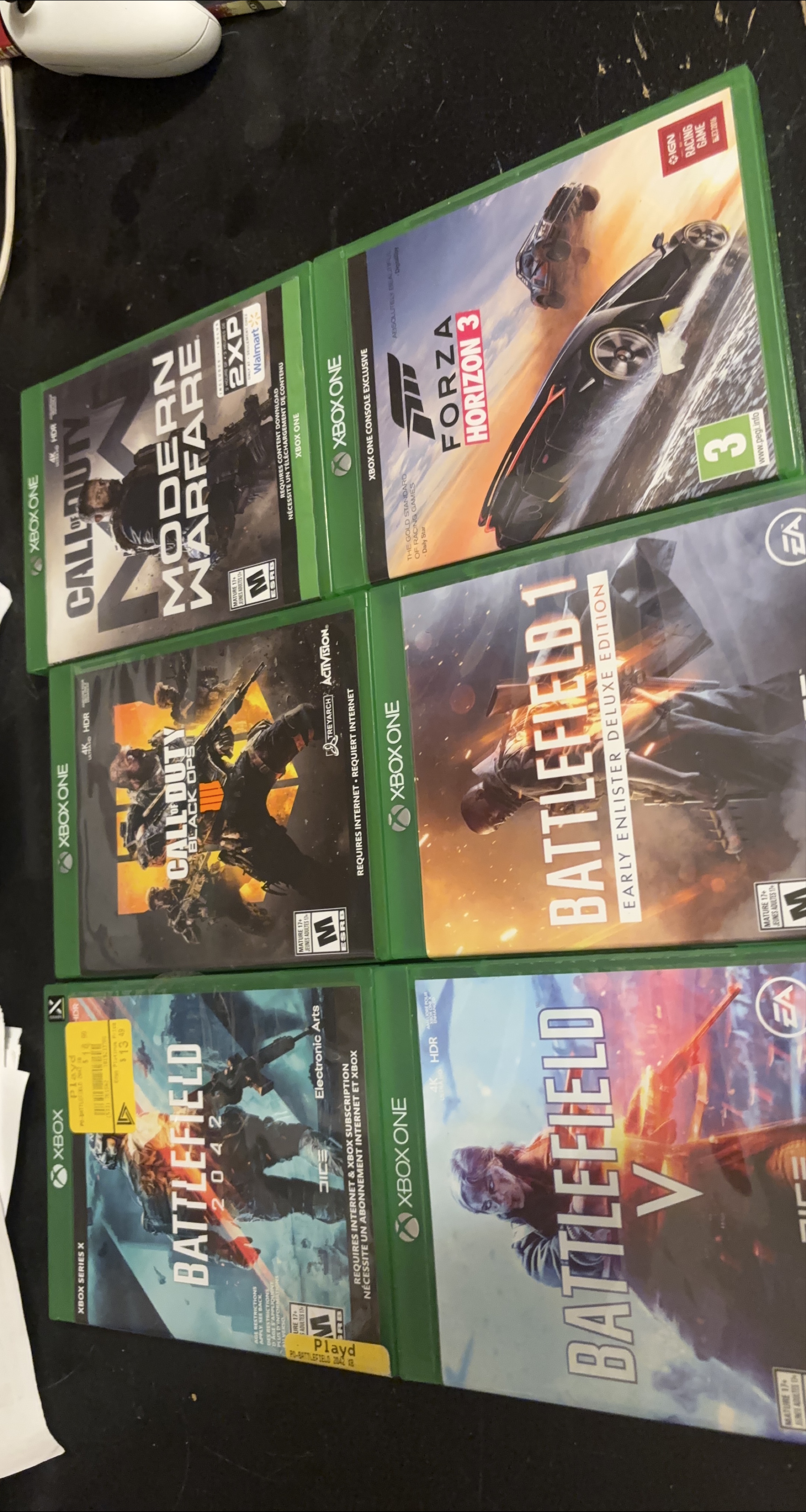 Selling a collection of Xbox games! Titles include: - Call of Duty: Modern Warfare (includes 2XP) - Call of Duty: Black Ops 4 - Battlefield 2042 - Battlefield 1 Early Enlister Deluxe Edition - Battlefield V - Forza Horizon 3
