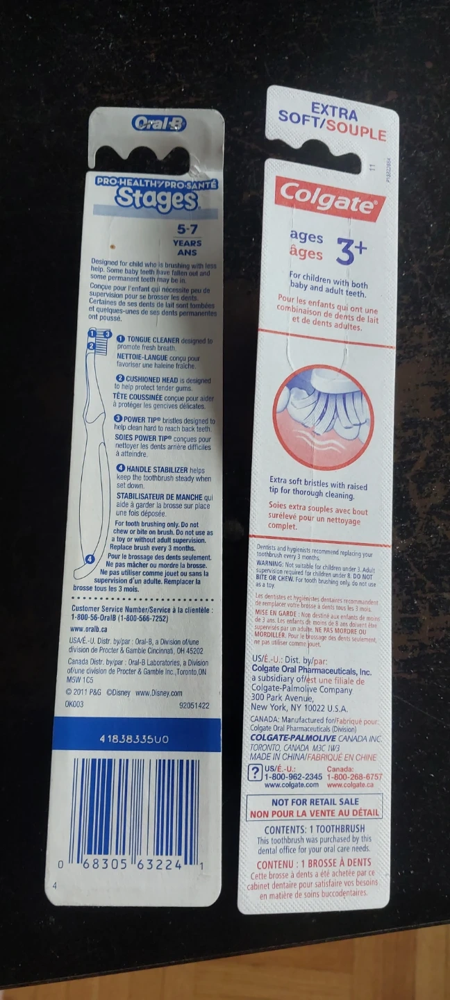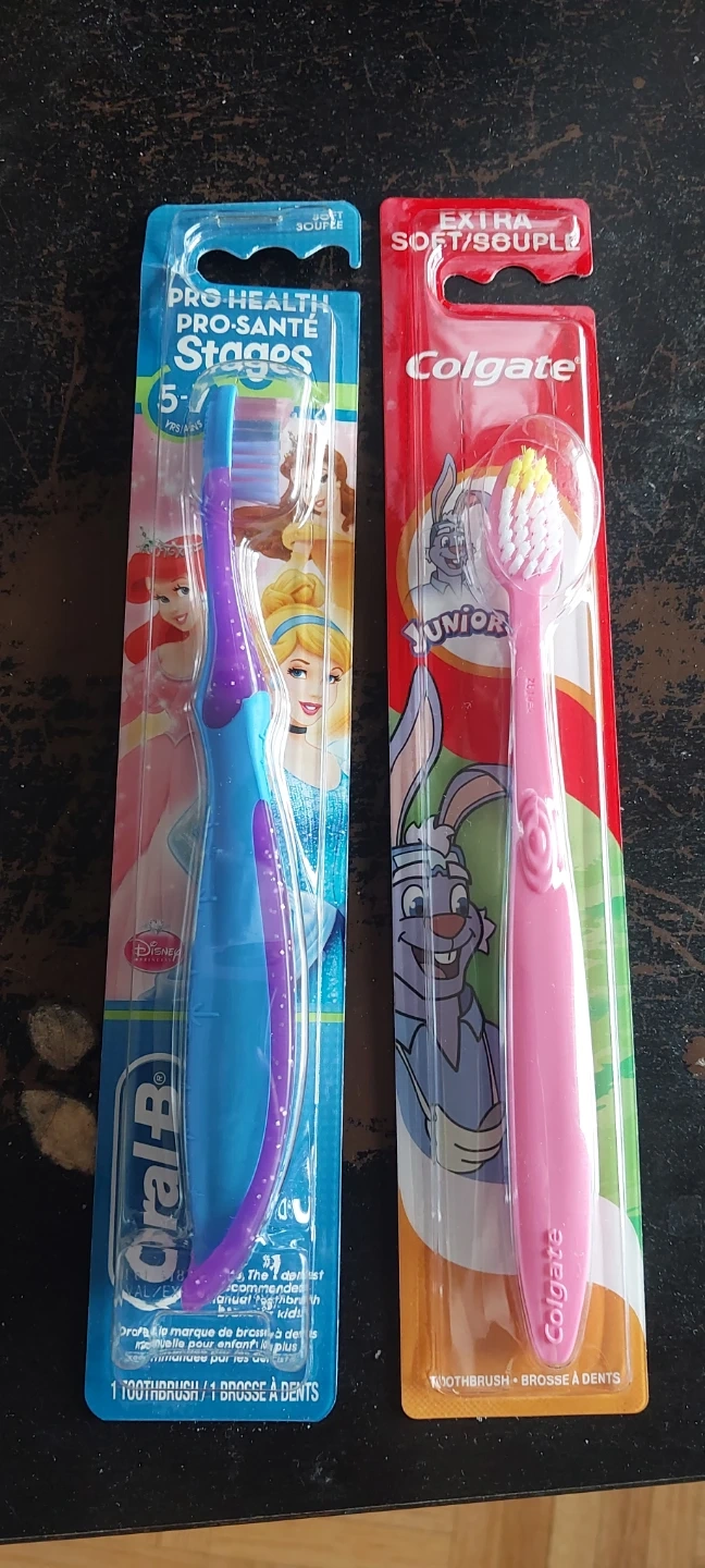 Two kids' toothbrushes: an Oral-B Stages for ages 5-7 and a Colgate Junior for ages 3+. These are new in package.