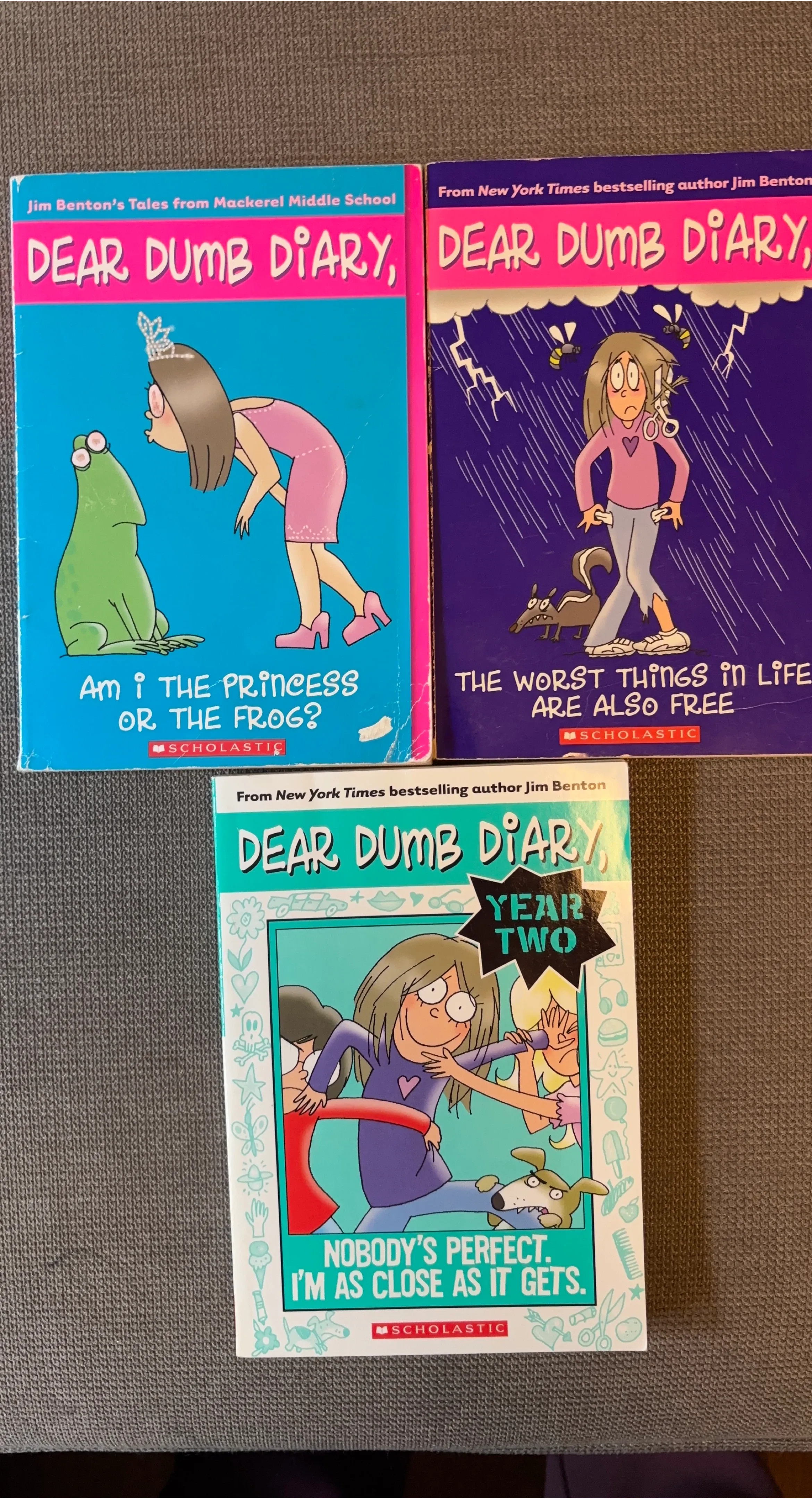 Three "Dear Dumb Diary" books by Jim Benton are included: "Am I The Princess Or The Frog?", "The Worst Things In Life Are Also Free", and "Year Two". These are paperback editions from Scholastic.