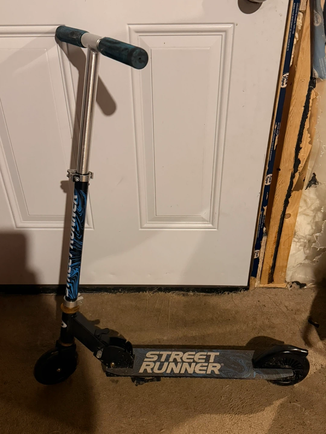 This is a Street Runner scooter with a blue and black design. It's built for riding around town. Great for getting from place to place quickly!