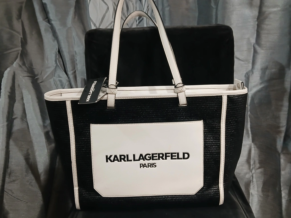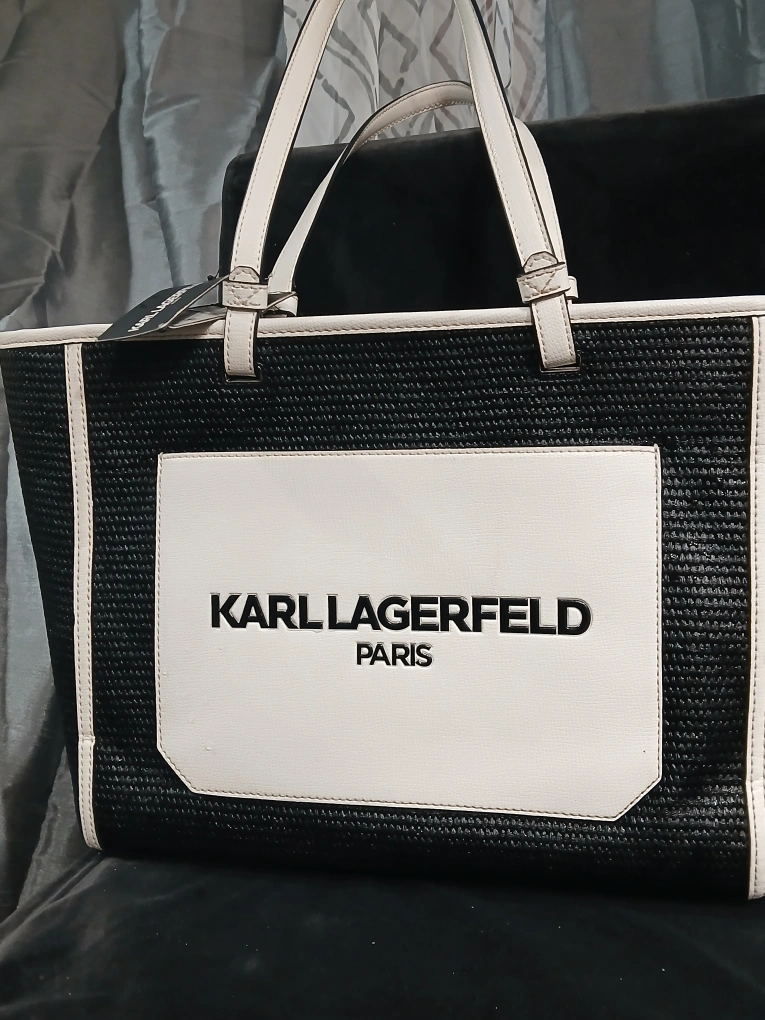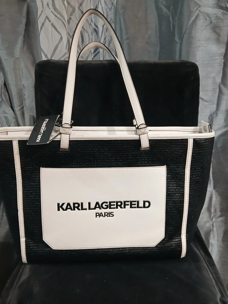 Large tote bag. Black woven exterior. White leather-like accents. Karl Lagerfeld Paris logo. Two handles. New with tag.