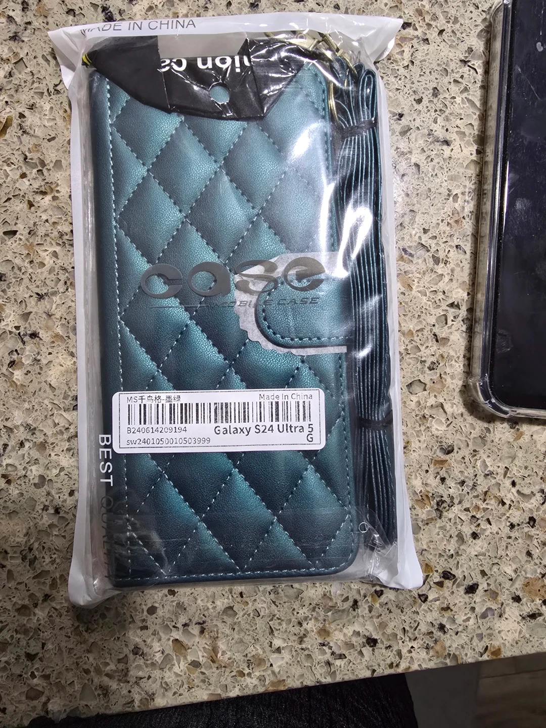 This is a quilted wallet-style phone case for the Samsung Galaxy S24 Ultra. It's made from faux leather and includes a lanyard. The case offers protection and a stylish look.