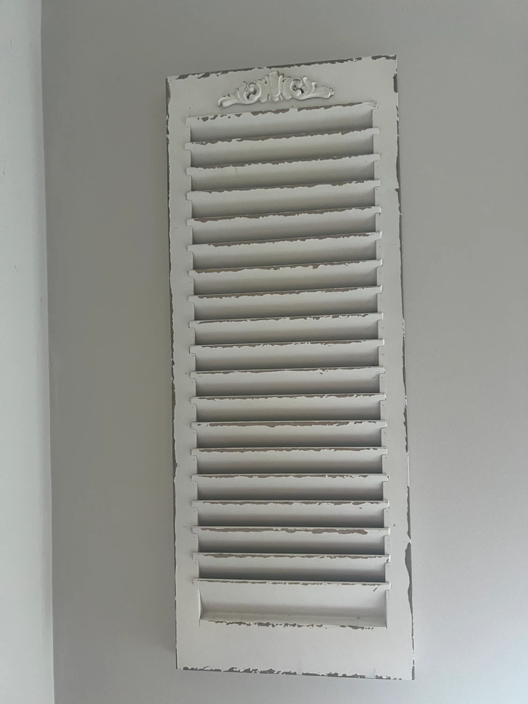 Selling a vintage white window shutter. It has a charming, distressed look that would be perfect for adding a touch of rustic style to your home decor. It's a unique piece that could be used as a decorative accent or repurposed for a creative project