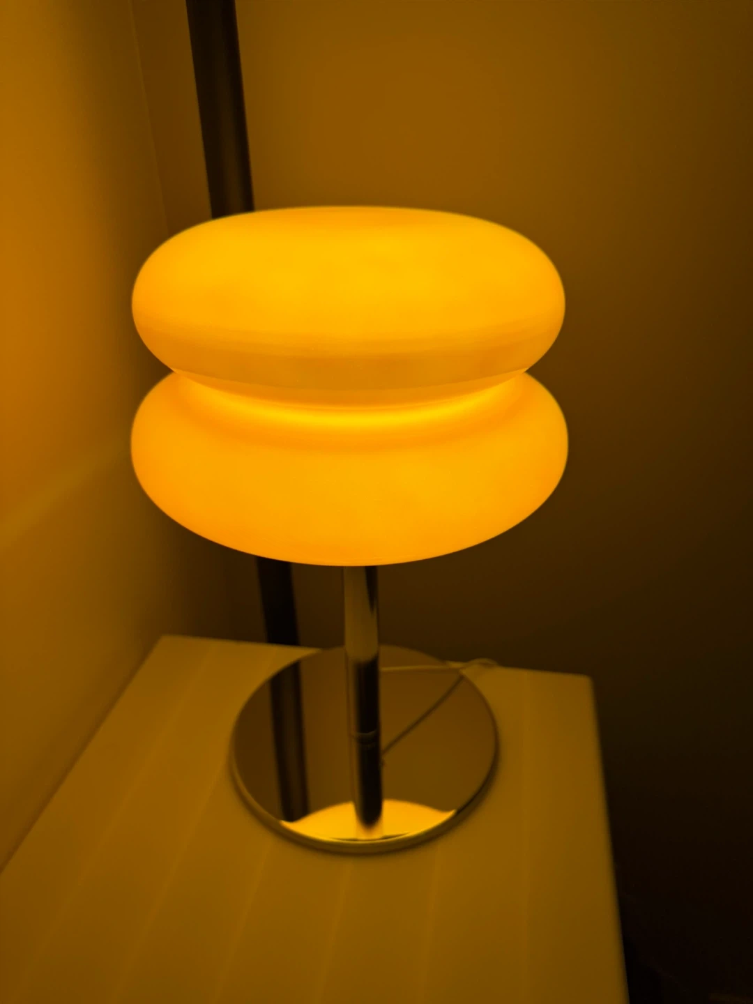 Stylish mushroom-shaped table lamp. Features a chrome base and a bright orange acrylic shade. It provides a warm, ambient glow when lit, perfect for a bedside table or accent lighting.