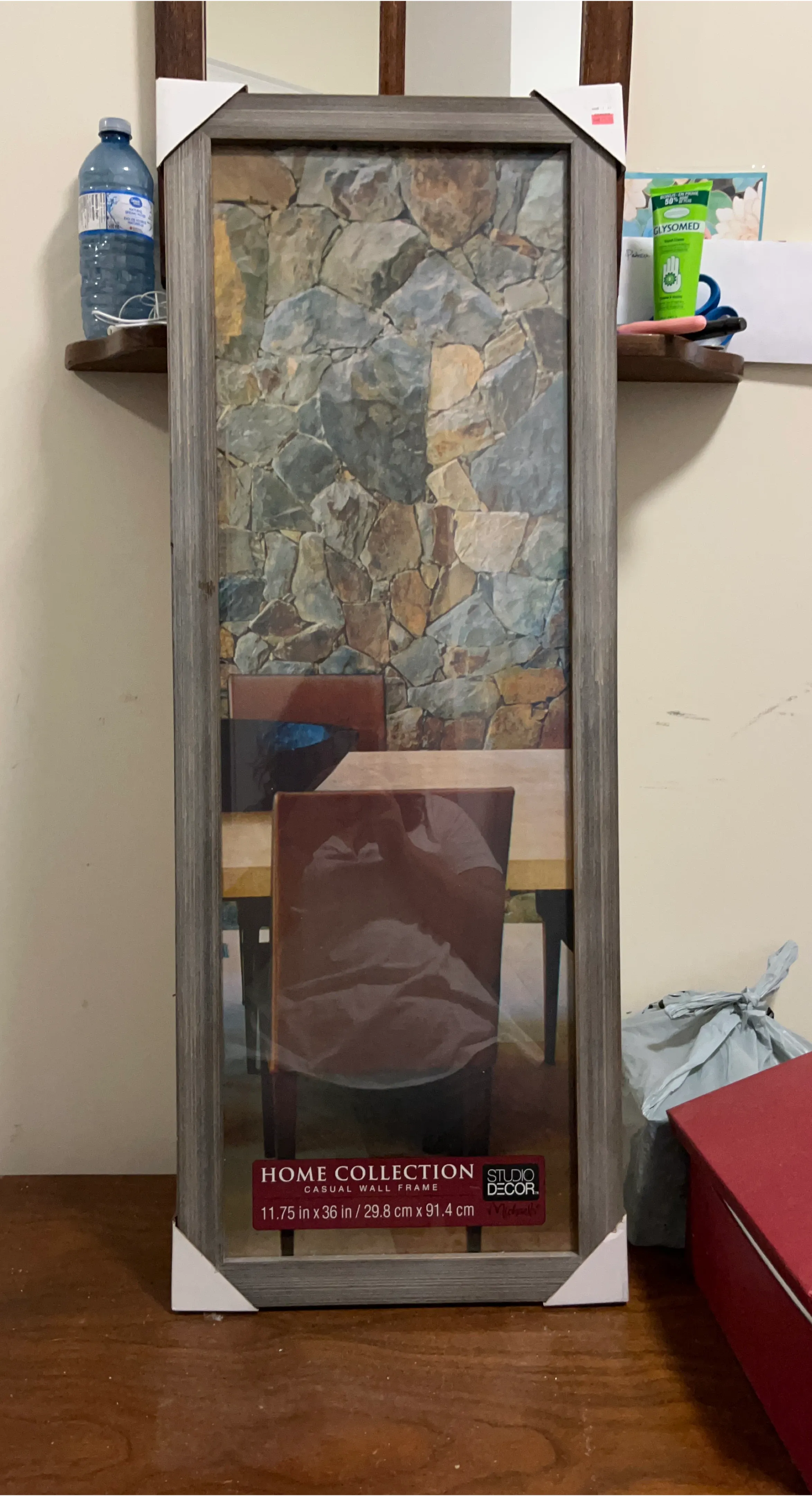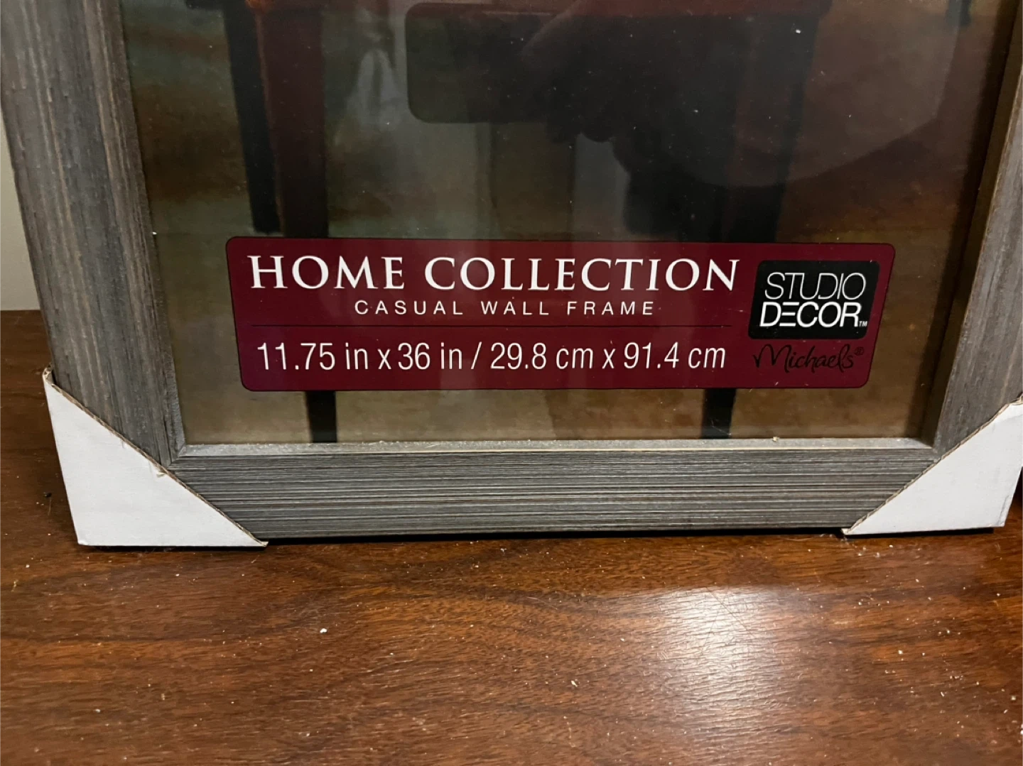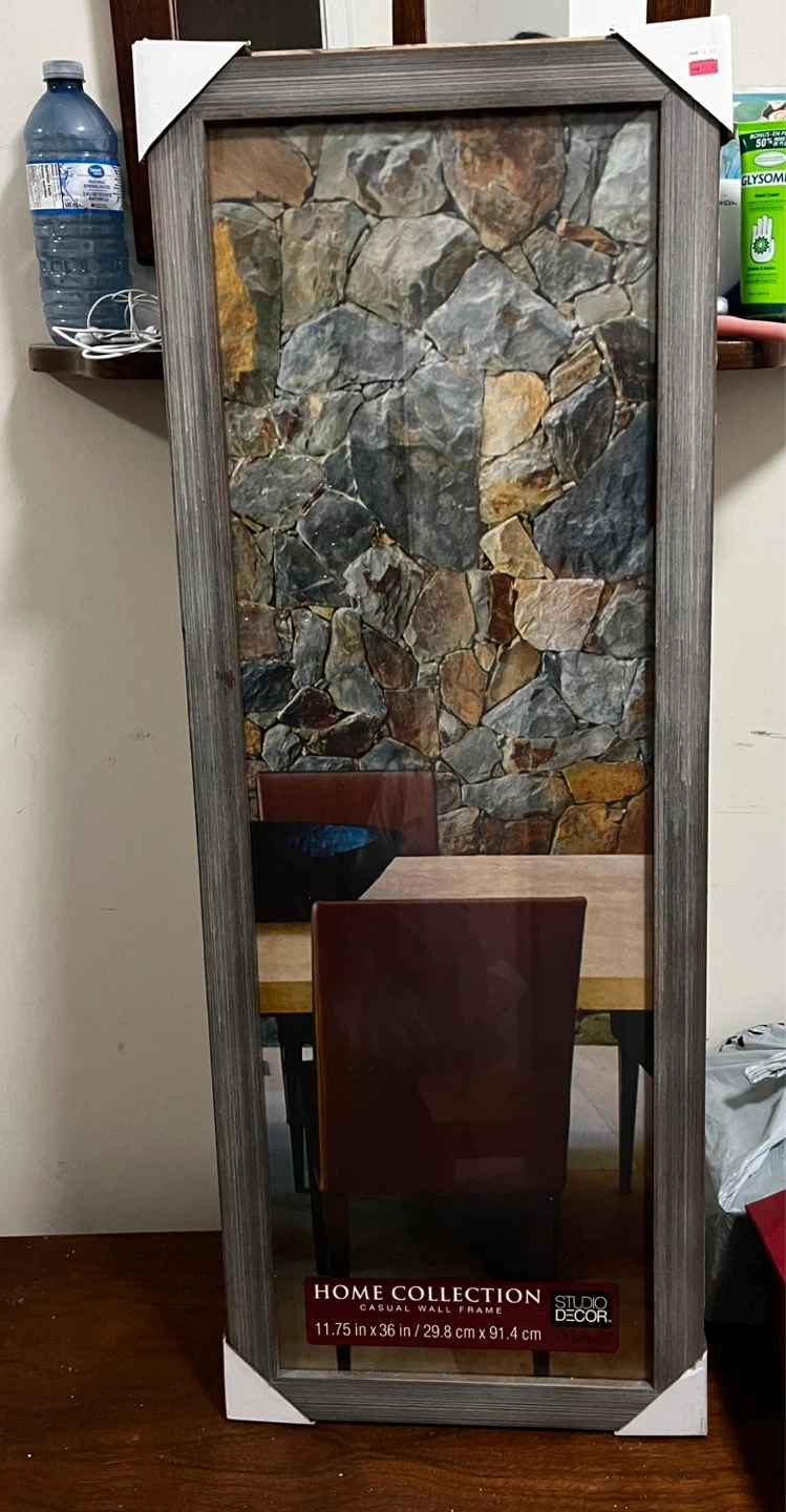 This is a casual wall frame from Studio Decor. It measures 11.75 inches by 36 inches. This is not freestanding, must be hung on a wall.