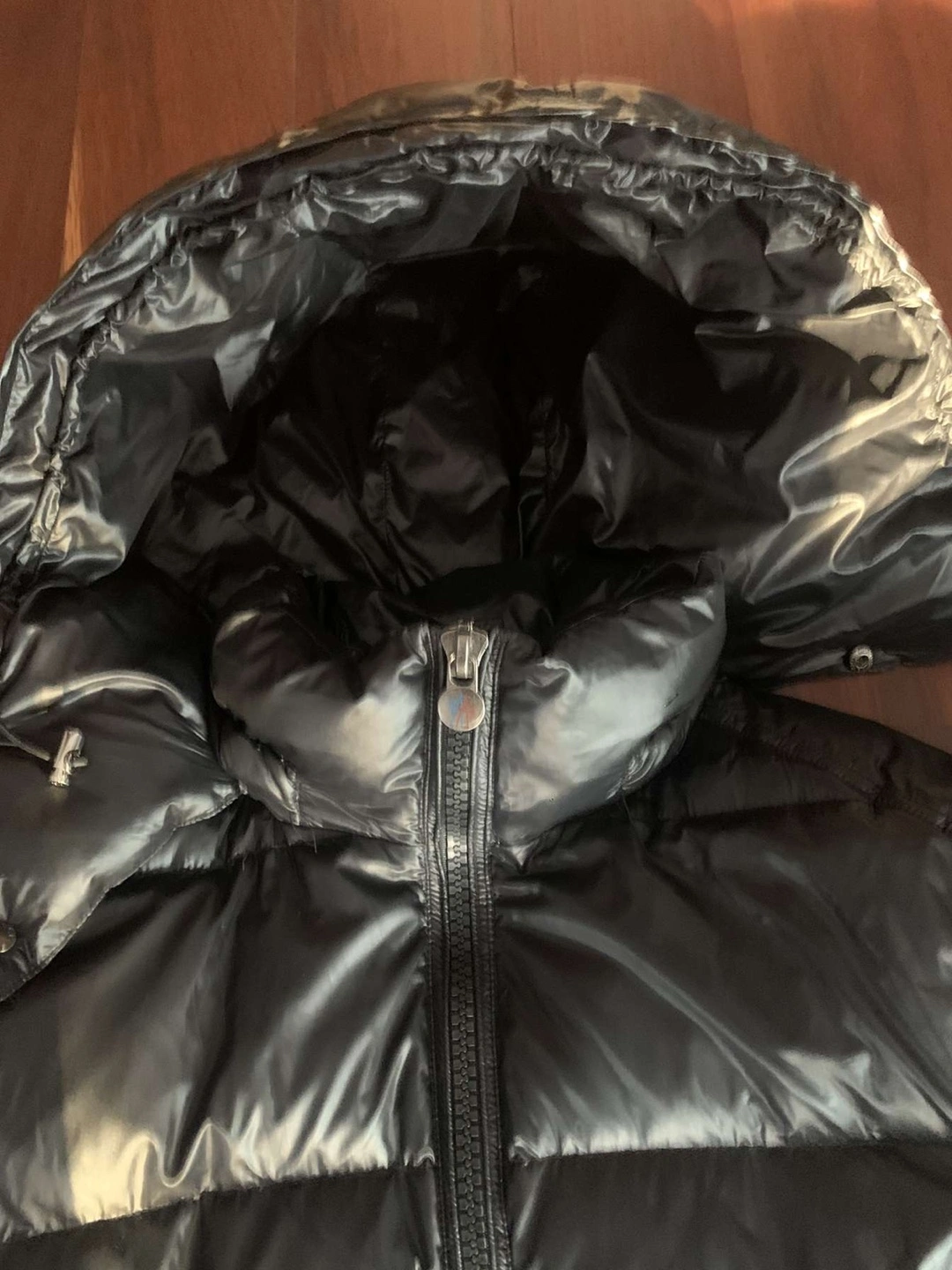 Black down jacket with a hood. Has two pockets on the front and a zipper closure. The jacket is in excellent condition.