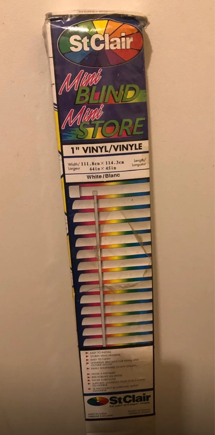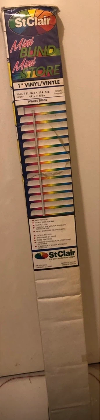 St Clair 1" vinyl mini blinds in white. Width is 111.8cm or 44 inches, and length is 114.3cm or 45 inches. Easy to install with sturdy vinyl headrail.