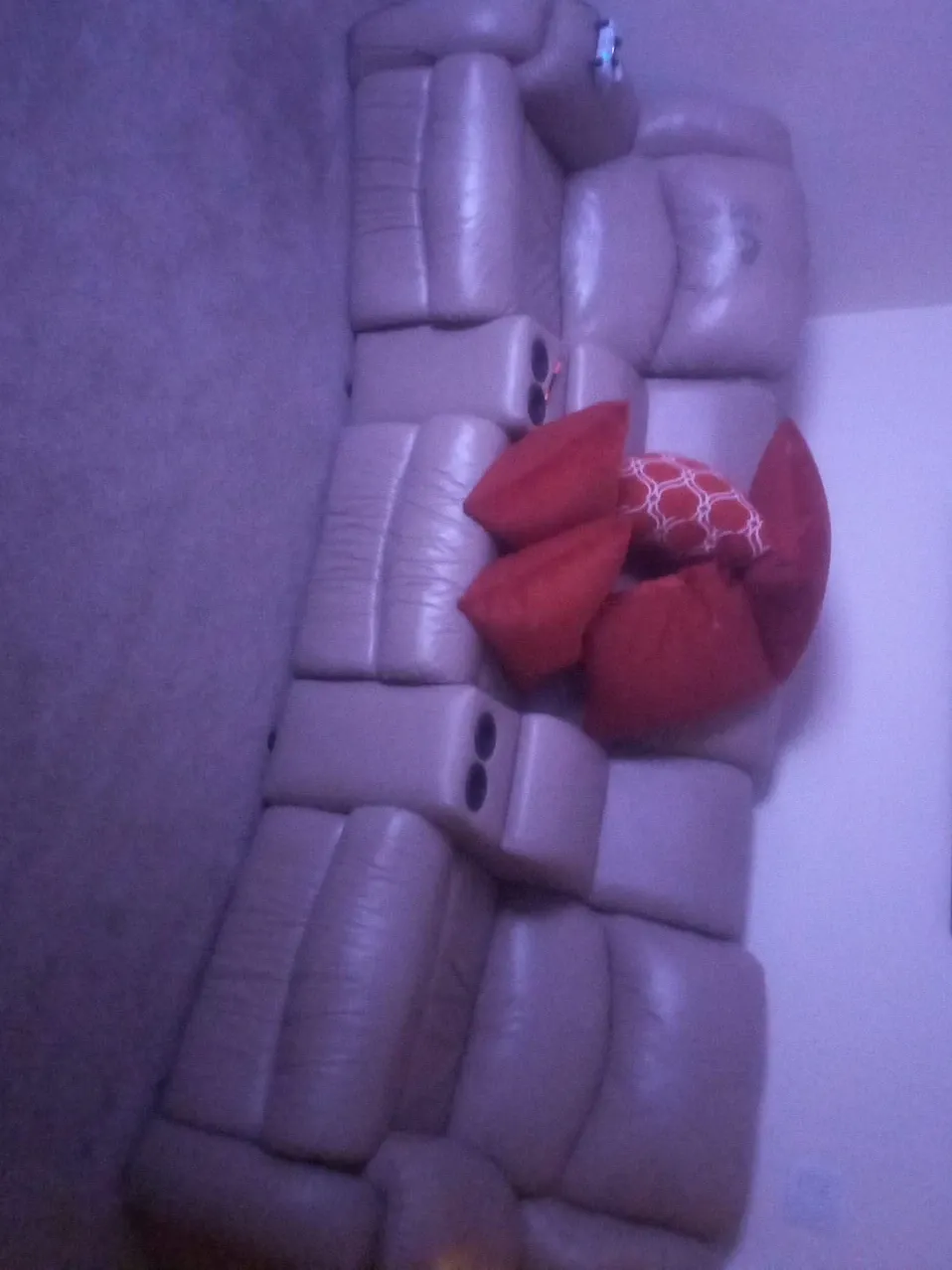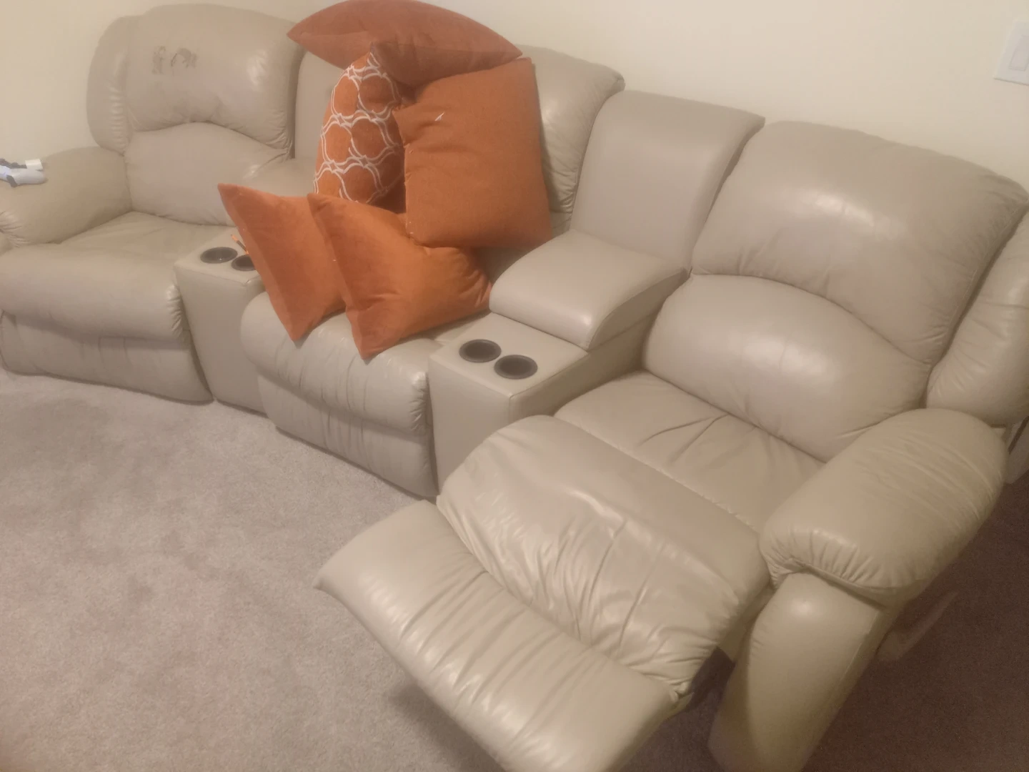 This light beige leather sofa features two recliners with built-in cup holders. It's great for creating a cozy home theatre experience. The sofa is made of durable leather material.