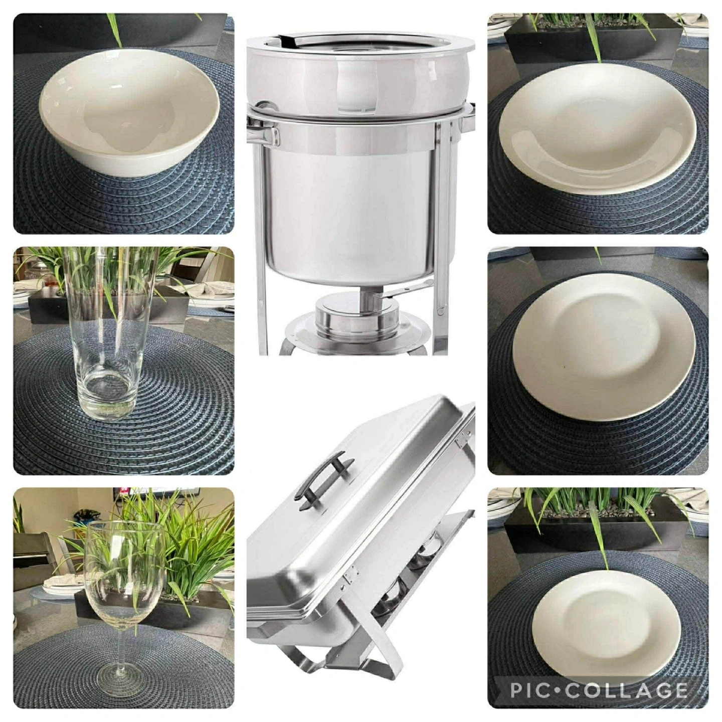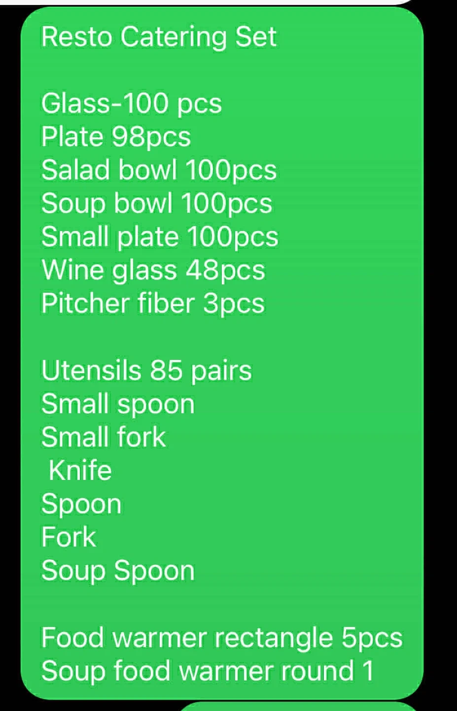 Catering set includes 100 glass plates, 98 salad bowls, 100 soup bowls, 100 small plates, 48 wine glasses, 3 pitcher fibers, and 85 pairs of utensils. Also includes rectangle and round food warmers.
