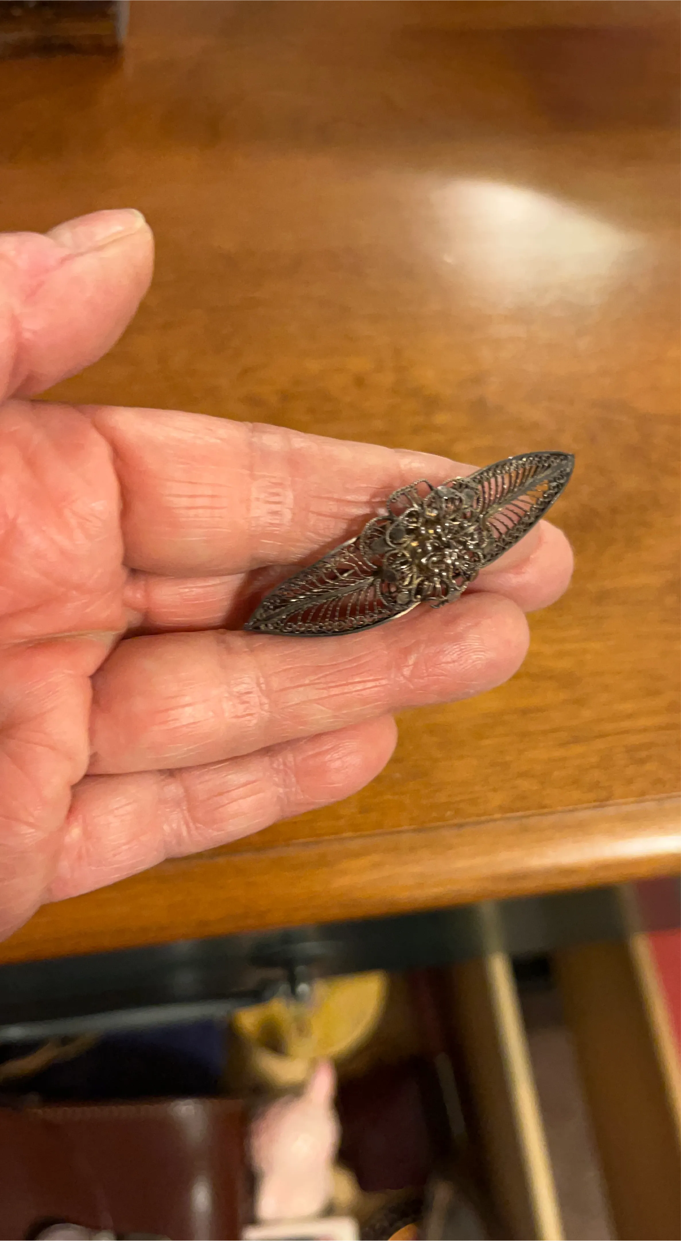 A delicate vintage brooch featuring intricate filigree metalwork. Its ornate design evokes a classic aesthetic. This piece is perfect for adding a touch of elegance to any outfit.