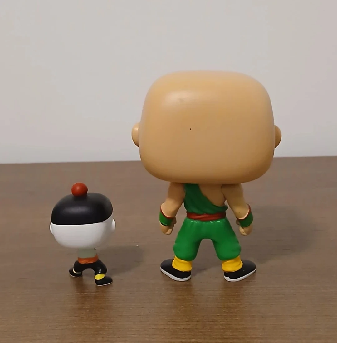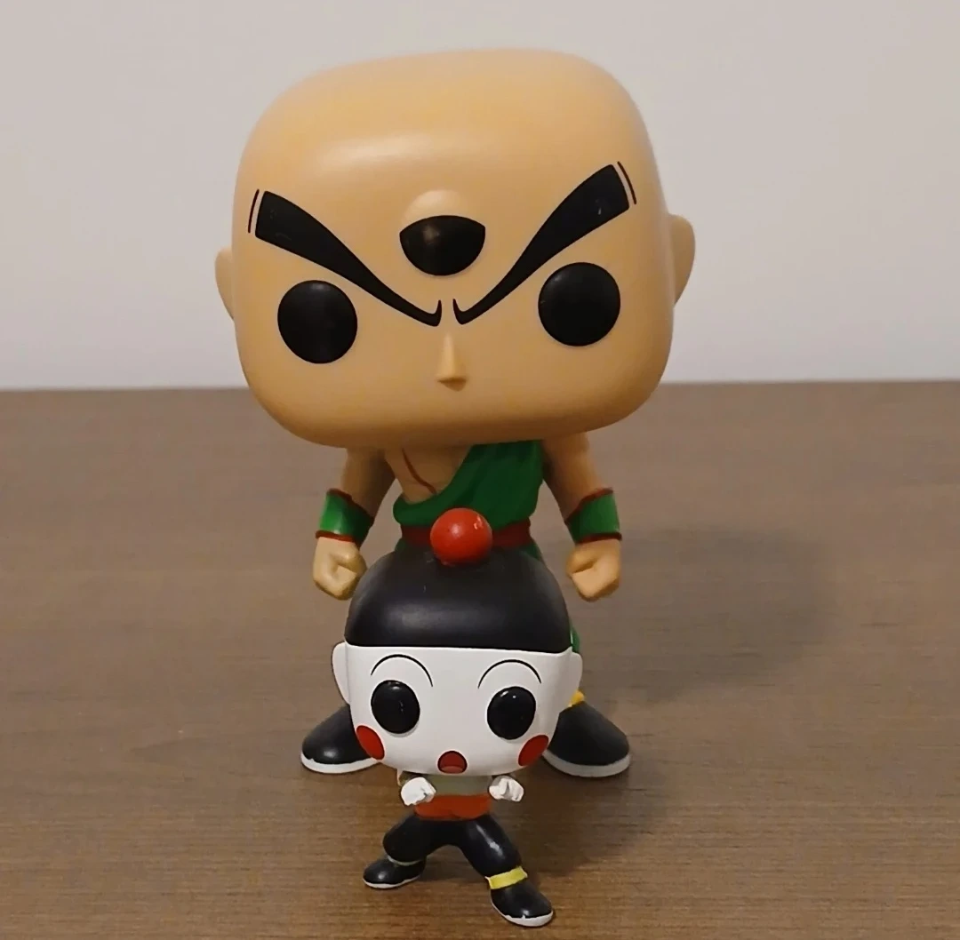 Two Funko Pop! vinyl figures featuring Tien Shinhan and Chiaotzu from Dragon Ball Z. Figures are made of vinyl. Great for collectors or fans of the series!