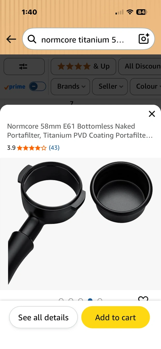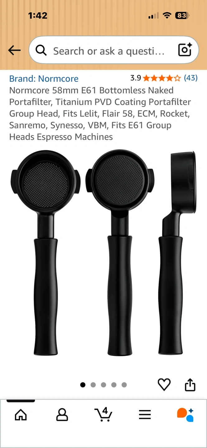 This Normcore portafilter is 58mm and features a naked, bottomless design with Titanium PVD coating. It's made from aluminum and stainless steel. It fits E61 group heads and various espresso machines like Lelit, Flair 58, ECM, Rocket, and Sanremo.