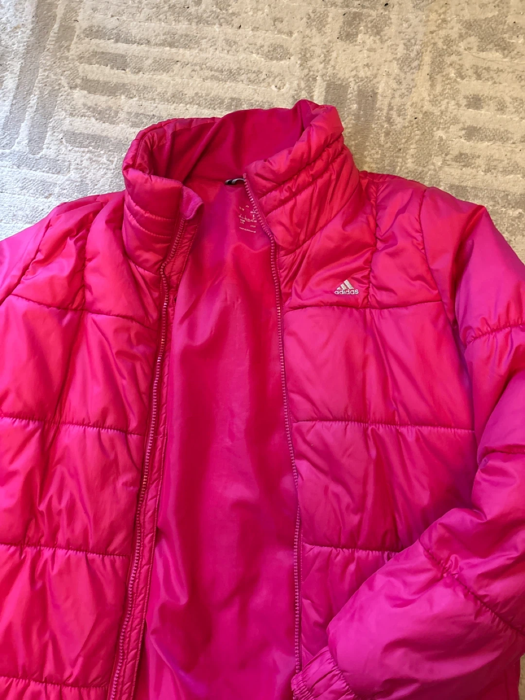 Selling a bright pink Adidas puffer jacket. It's in great condition and perfect for keeping warm on chilly days!