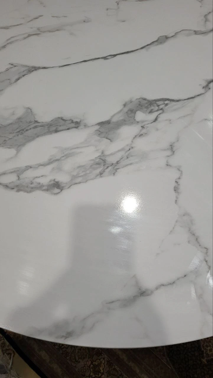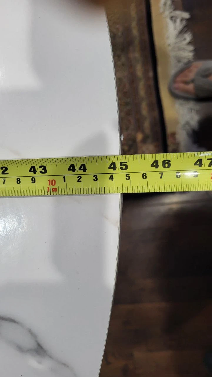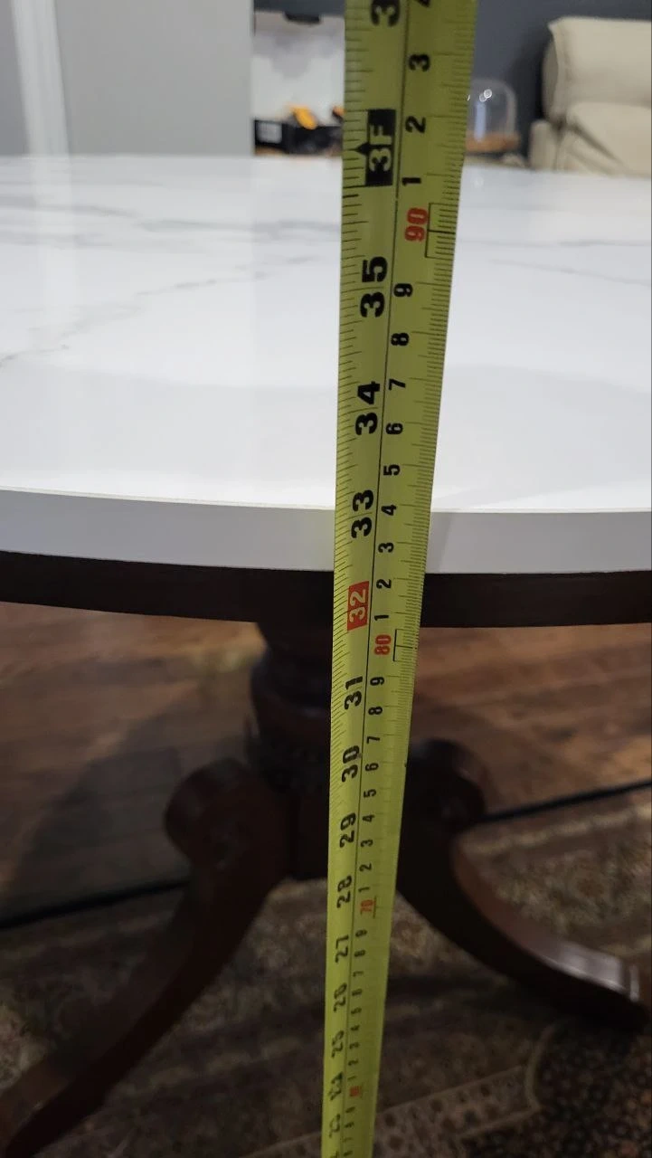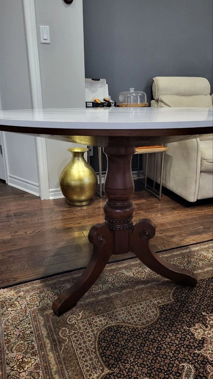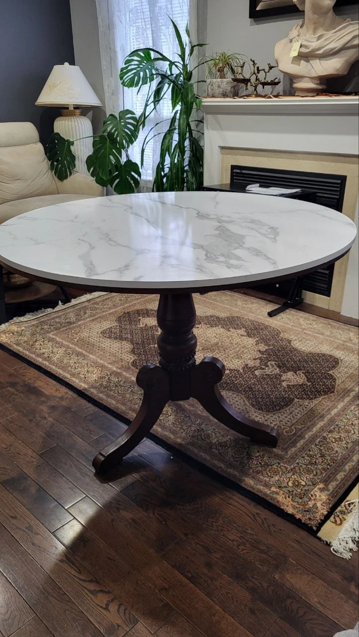 Selling a round dining table with a faux marble top. It measures approximately 45 inches in diameter. The base is a dark wood colour. It's in great condition and ready for a new home!