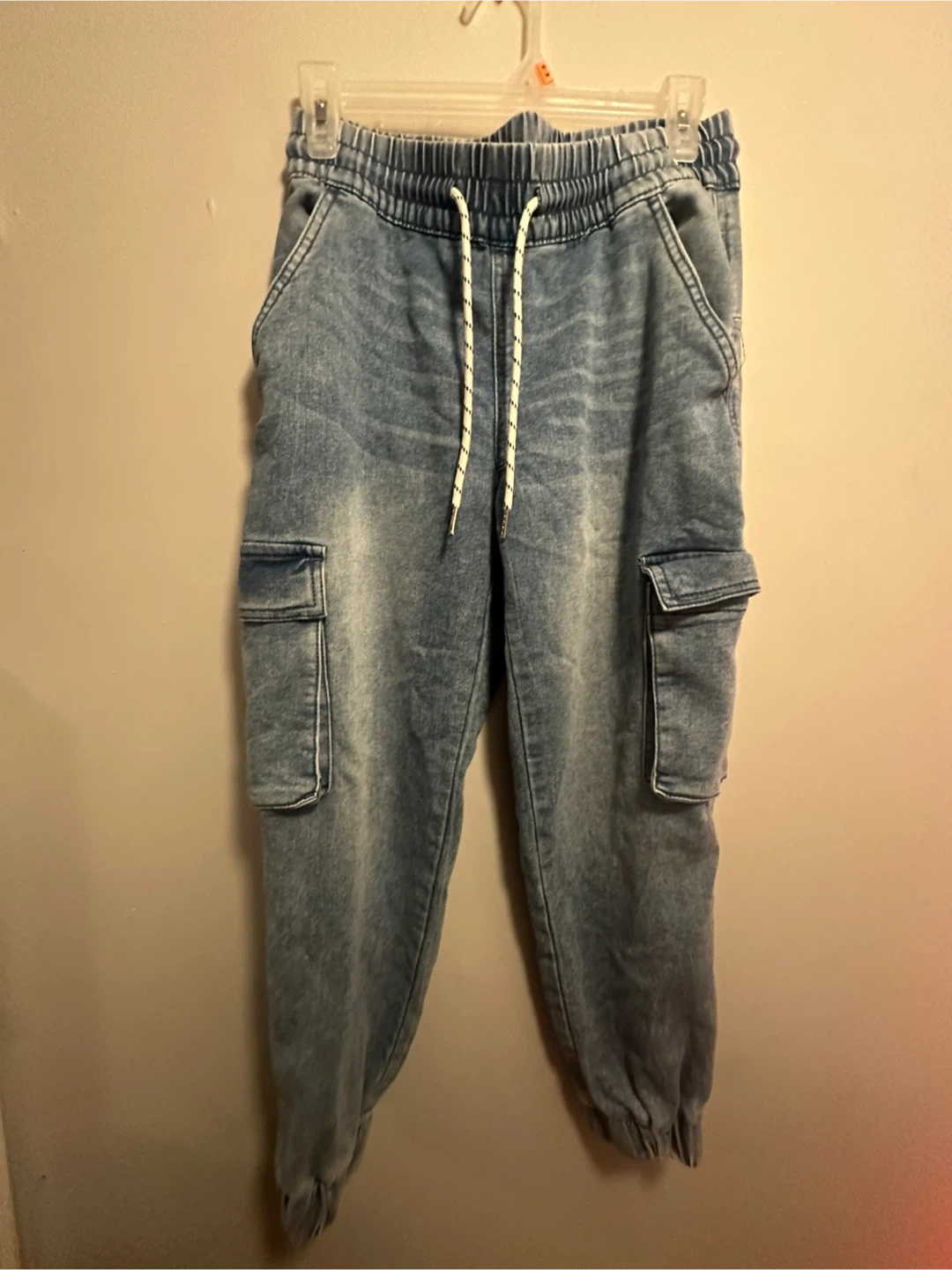 These light wash denim cargo jogger pants have a drawstring waist and cuffed ankles. They're made from a soft, flexible denim fabric. These pants are great for casual wear.