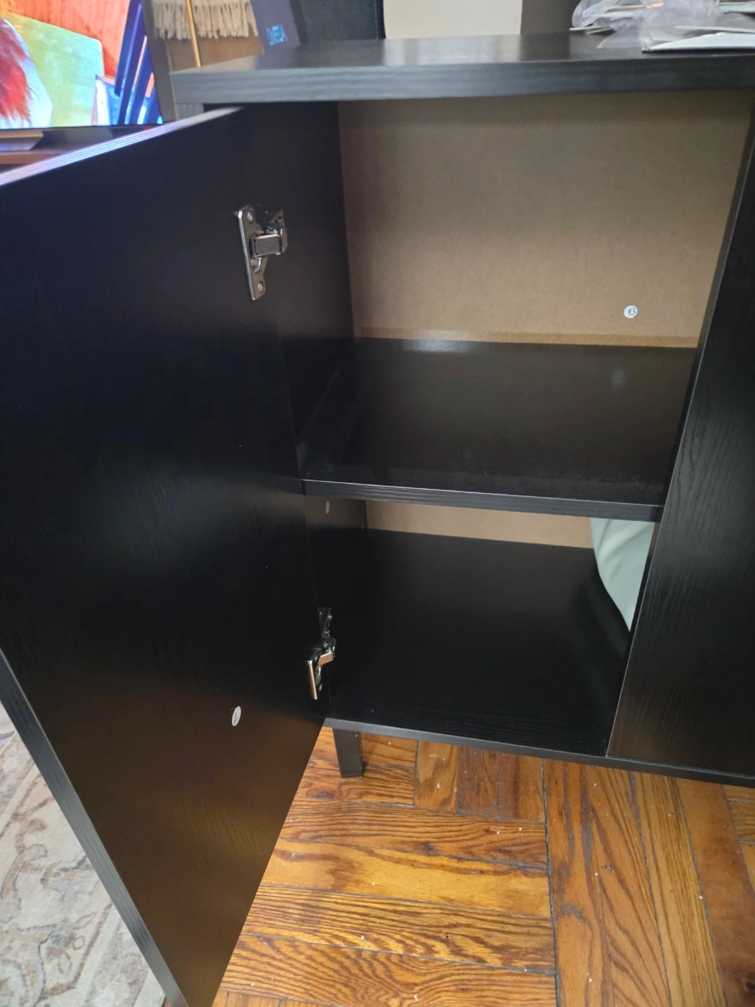This is a black two-door cabinet with adjustable shelves. It's made of wood and has a modern design. It provides ample storage space for various items.