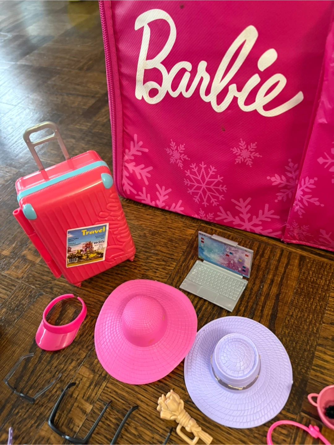 This Barbie set includes a doll, a pink suitcase, a large pink travel bag, and numerous travel-themed accessories. It comes with hats, shoes, handbags, a laptop, and more.