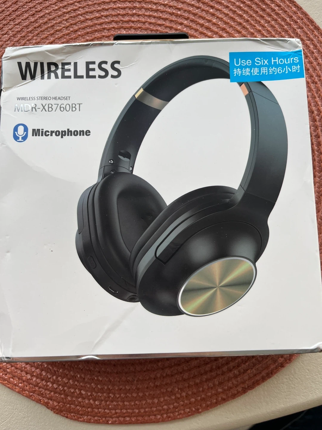 This is a black MDR-XB760BT wireless stereo headset with a built-in microphone. It includes an audio cable and a charging cable. The headset has a 40mm driver unit and weighs 165g without the cable. The original packaging is included.