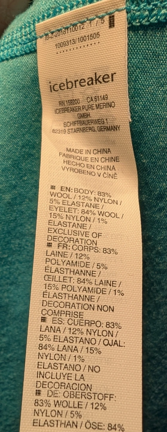 Icebreaker Merino 150 Zone t-shirt for women in XL. It's made with 83% wool, 12% nylon, and 5% elastane for the body. The eyelet fabric is 84% wool and 15% elastane. This shirt is great for layering and outdoor activities.