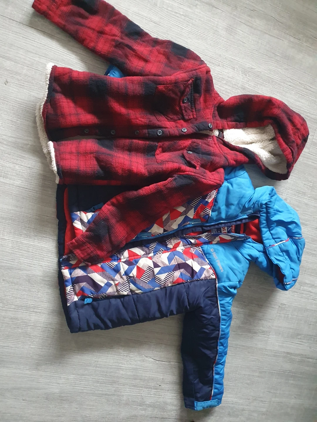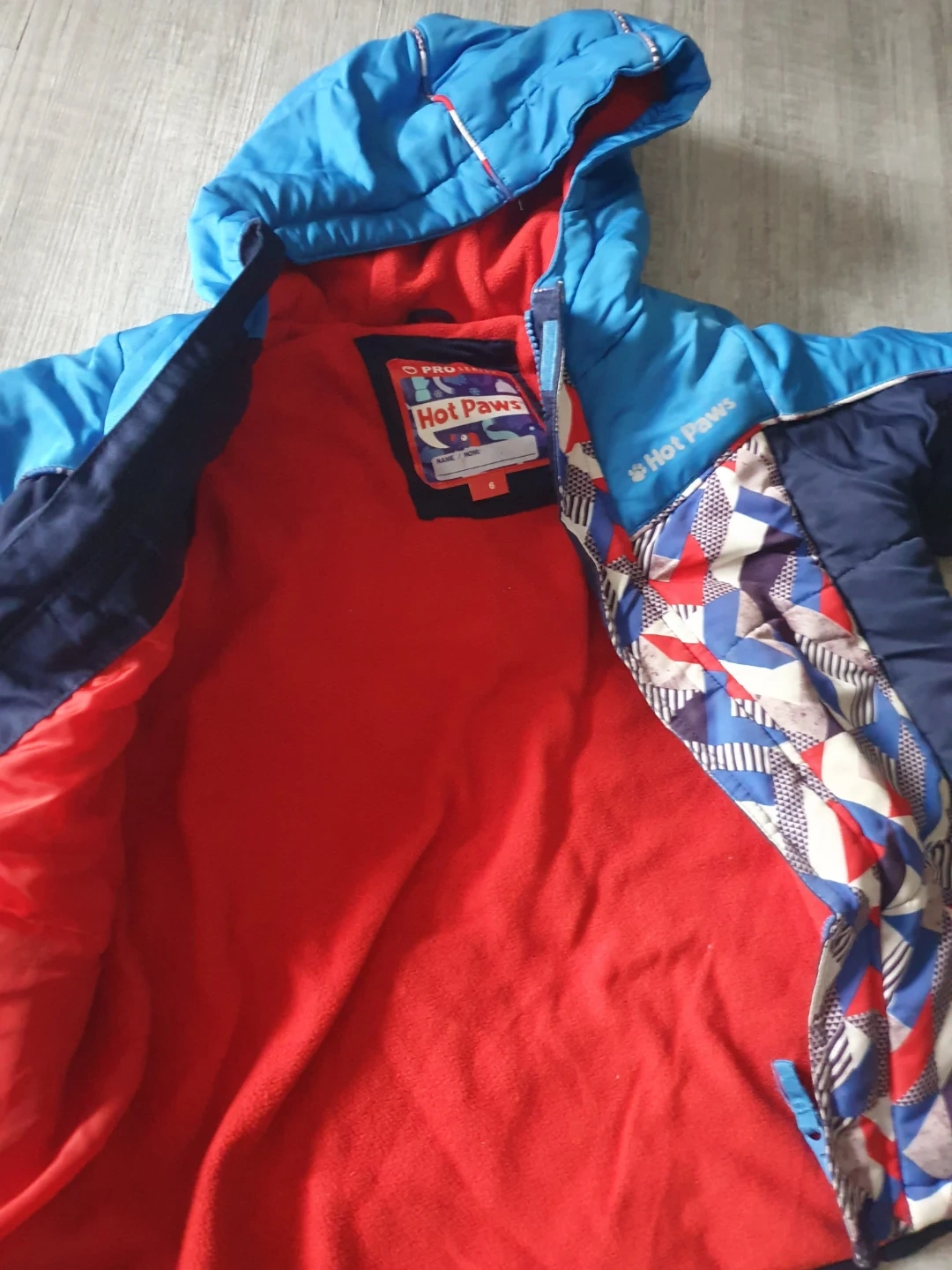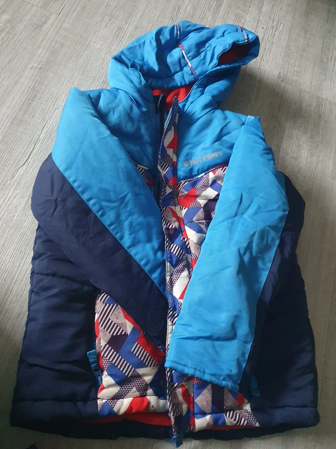 This is a blue Hot Paws winter jacket for kids. It's insulated and has a hood. The jacket and cozy sweater is size 6. Together $5