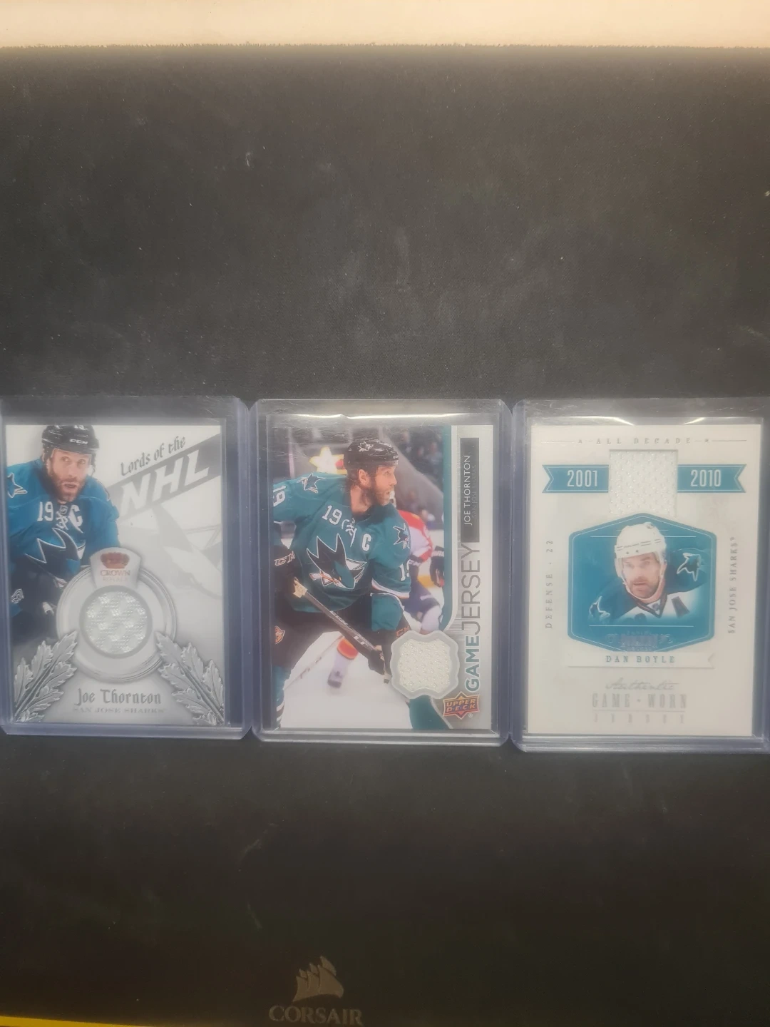 Three hockey cards featuring Joe Thornton and Dan Boyle of the San Jose Sharks. Includes a 'Lords of the NHL' card with a jersey swatch and a 'Game Jersey' card with a swatch. Also includes a 'Dan Boyle Authentic Game-Worn' card.