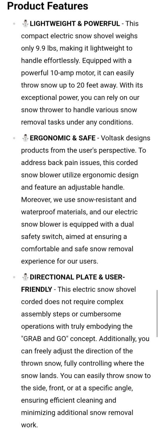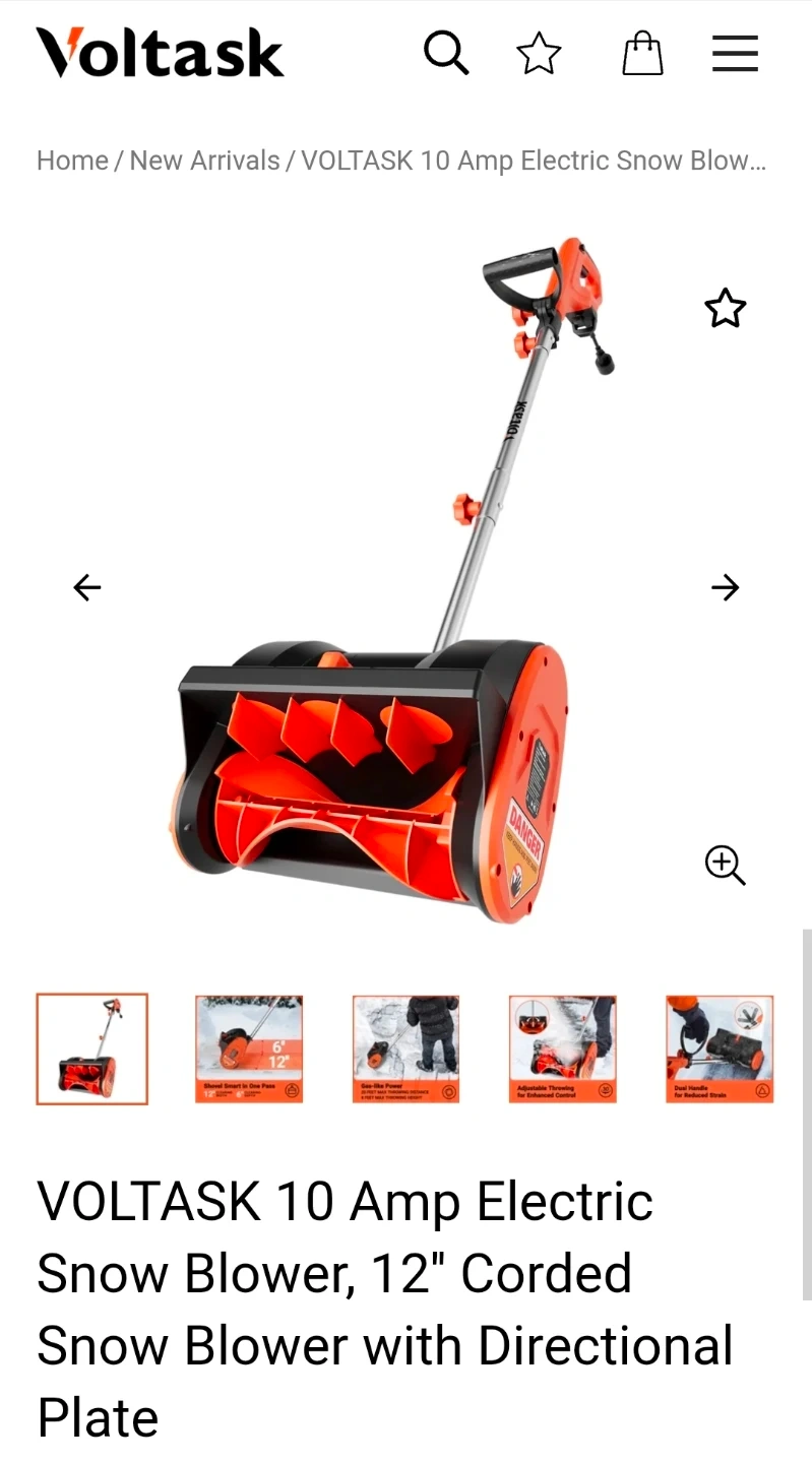 I'm selling a Voltask 10 Amp Electric Snow Blower with a 12" corded directional plate. This snow blower is lightweight at only 9.9 lbs and has a powerful 10-amp motor that can throw snow up to 20 feet. This item is in like new condition.