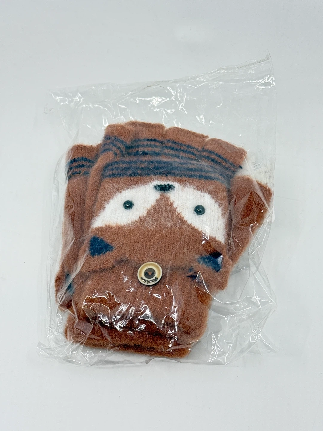 Cute brown mittens with a flip-top design, featuring a fox face. These gloves have a cozy feel and are perfect for keeping little hands warm.
