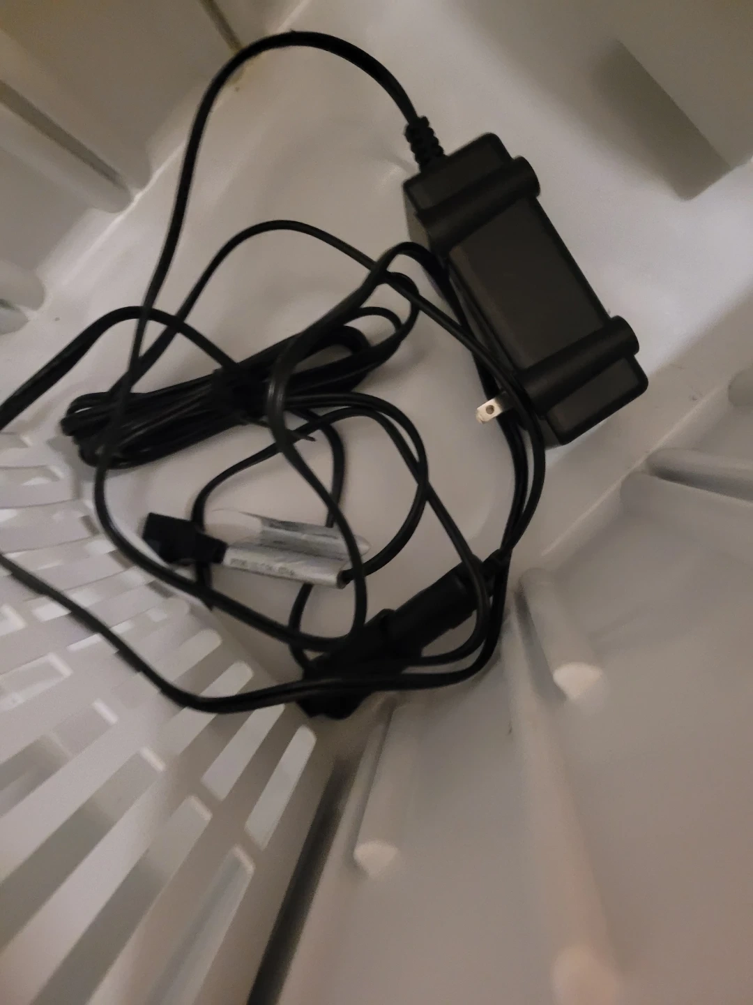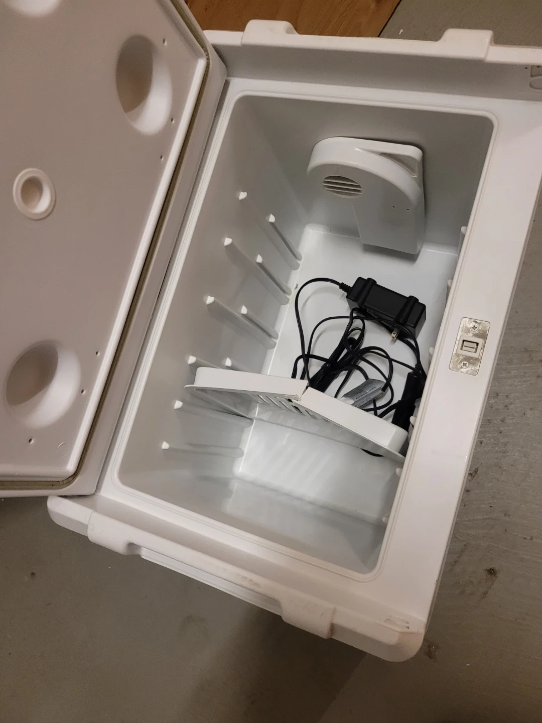 This is a portable cooler. It comes with a power adapter and cord. It's white and made of plastic.Has a car plug too.It is a cooler and warmer