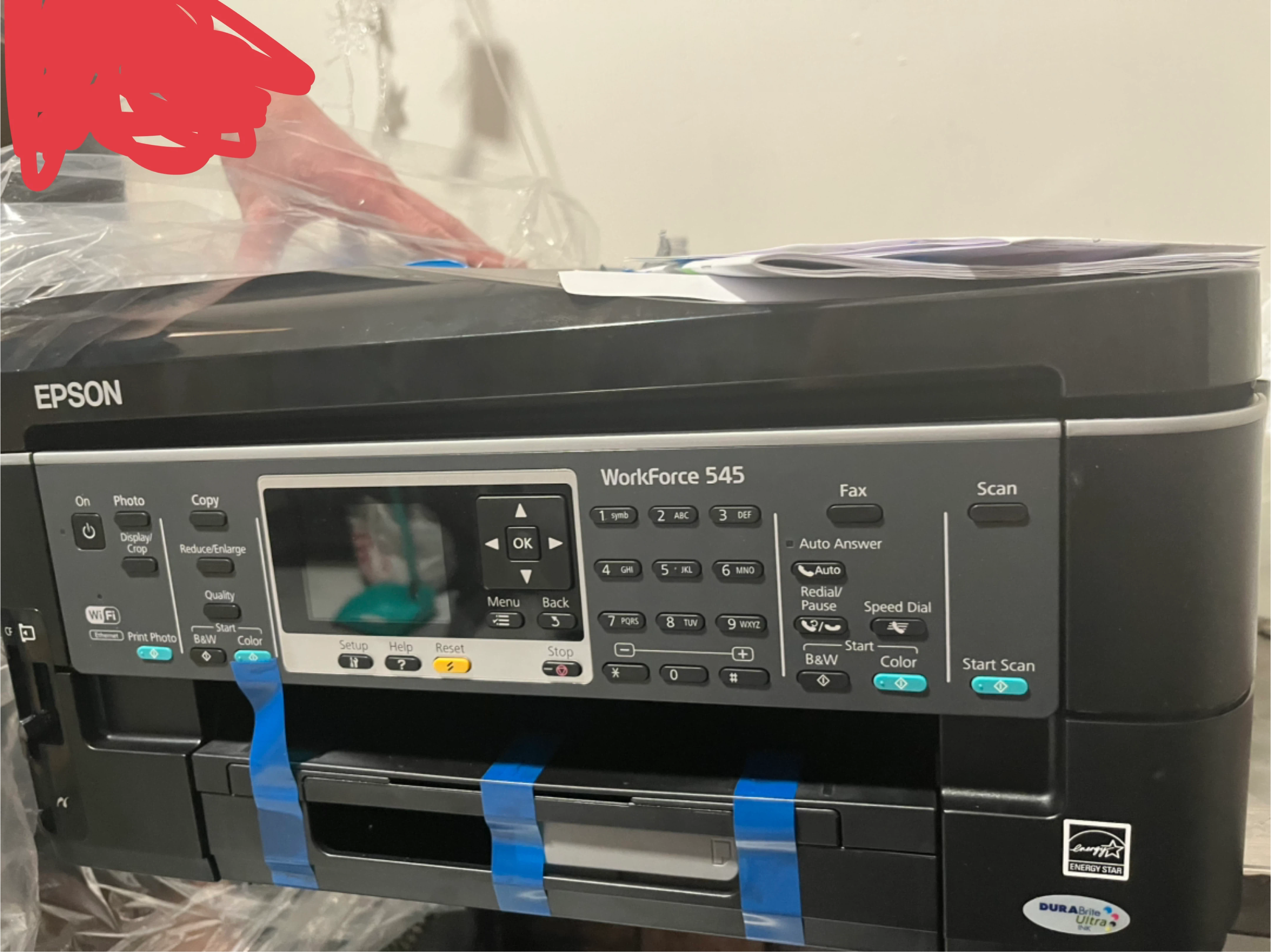 This is an Epson WorkForce 545 all-in-one printer. It's a black unit that functions as a printer, fax, and scanner. Includes original software CD.