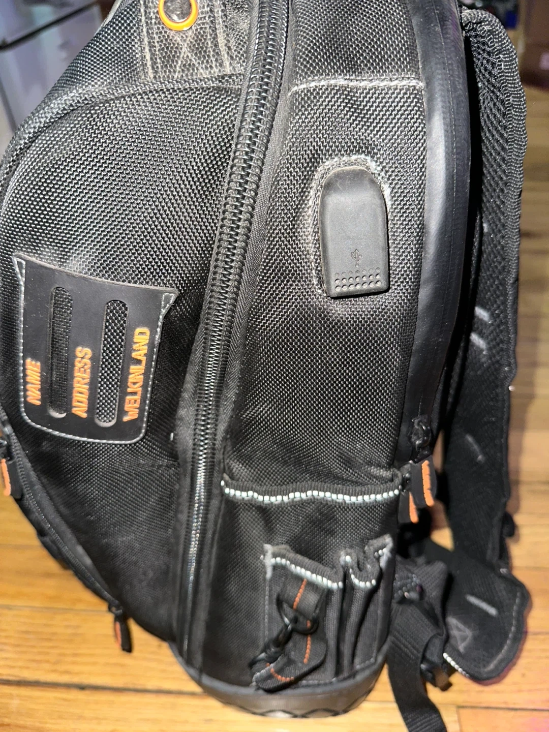 This is a black Welkinland tool backpack. It features multiple compartments and pockets for organization. Durable construction with reinforced stitching. It's perfect for carrying tools and equipment on the go! 1 time use, and port charger for power bank