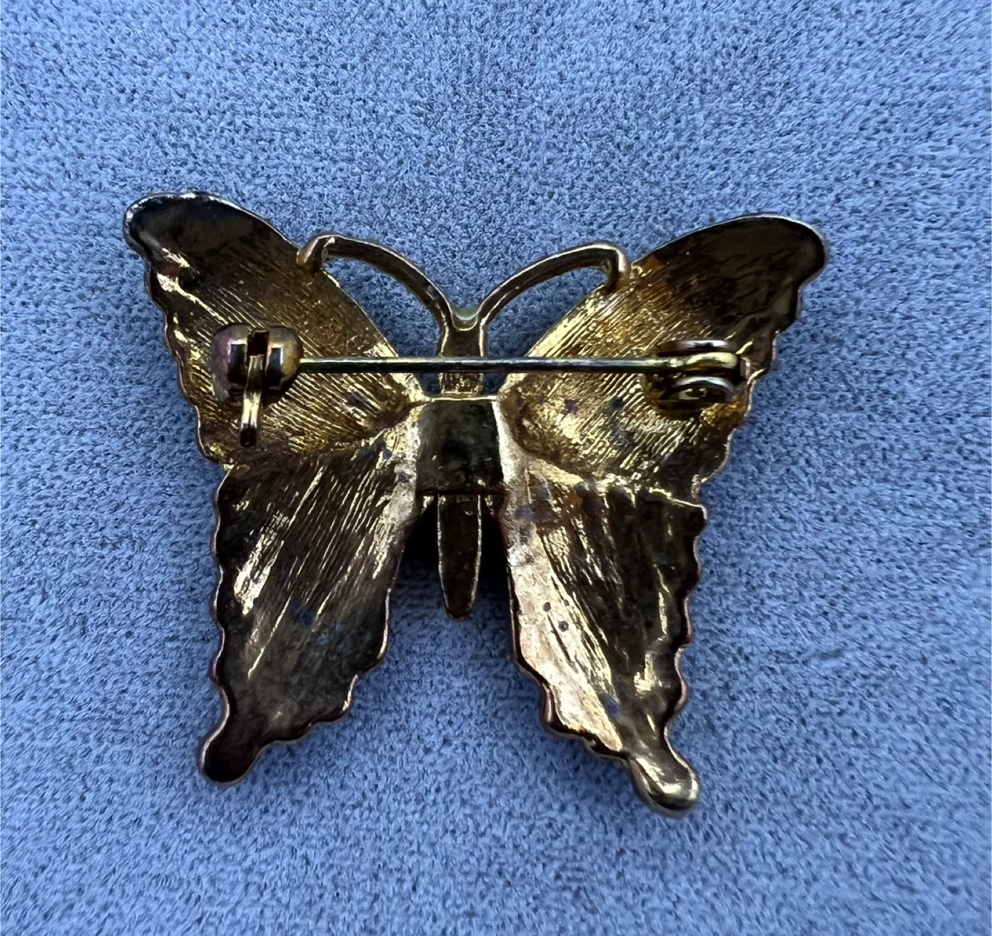 Green enamel detailing and small blue rhinestones on the wings