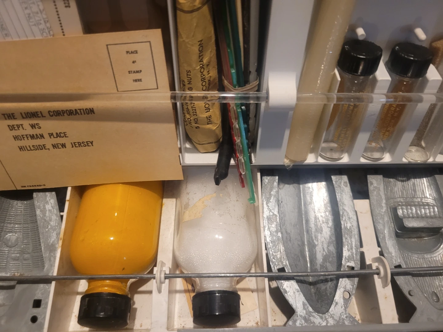 This is The Lionel Corporation Plastics Engineering Lab II. It includes various molds, a yellow bottle, a white granular substance in a bottle, and other small components. Some parts appear to be made of metal and plastic.
