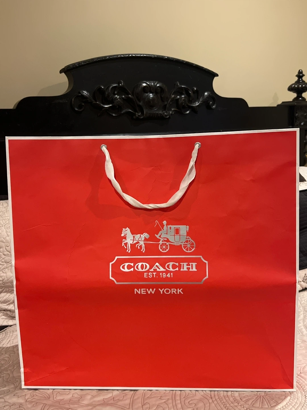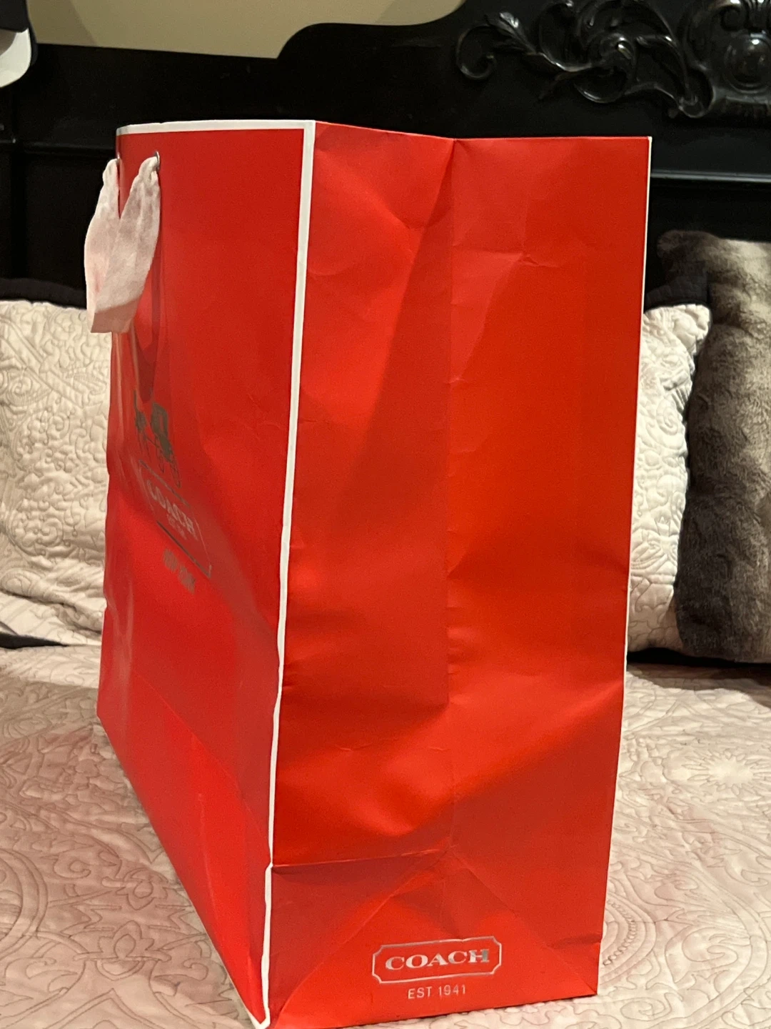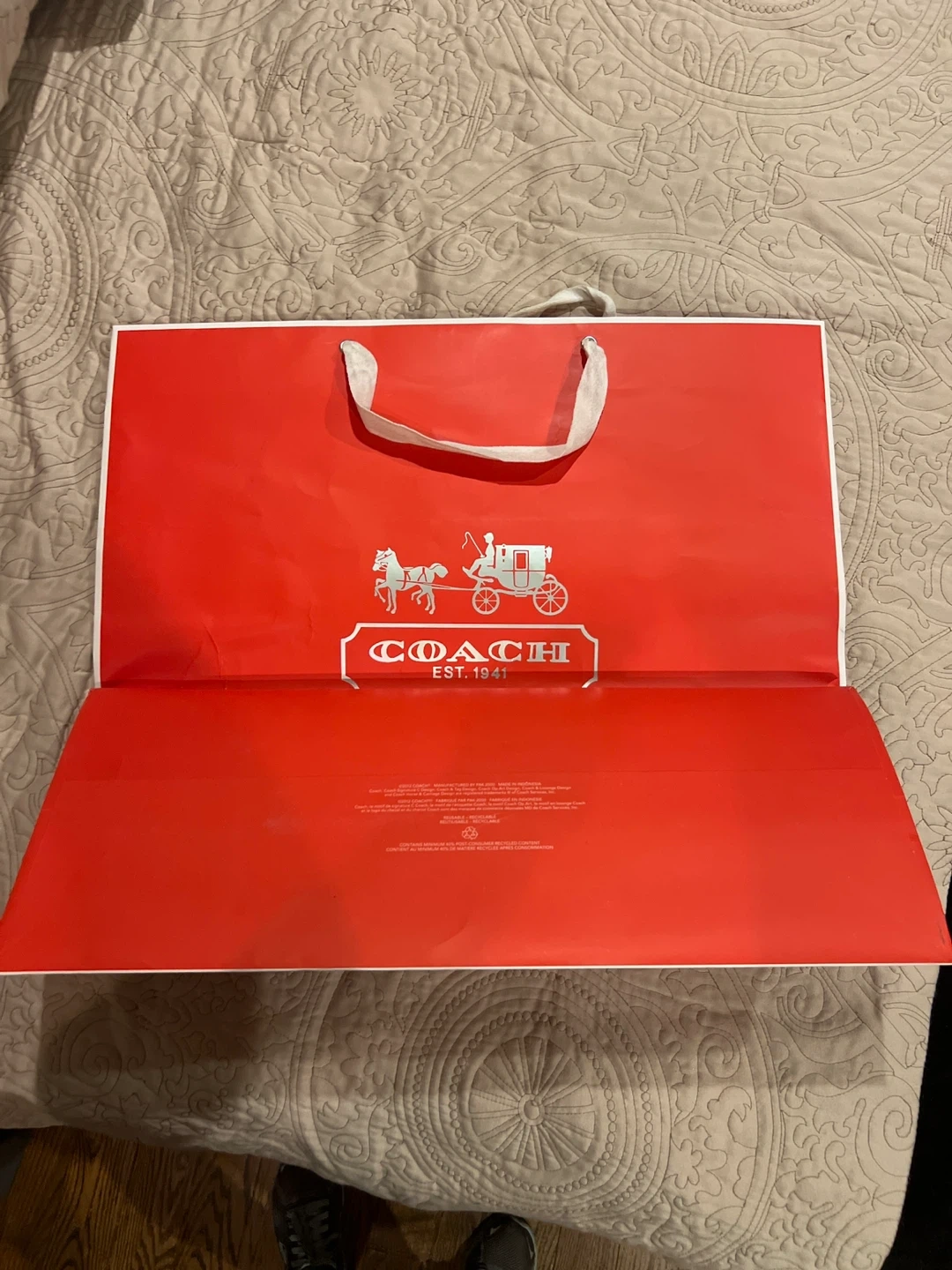 This is a red Coach shopping bag. It has white rope handles and the Coach logo. Bag is empty and ready for use. Aprox measurements. 18.5” long 20” wide and 7.5 side