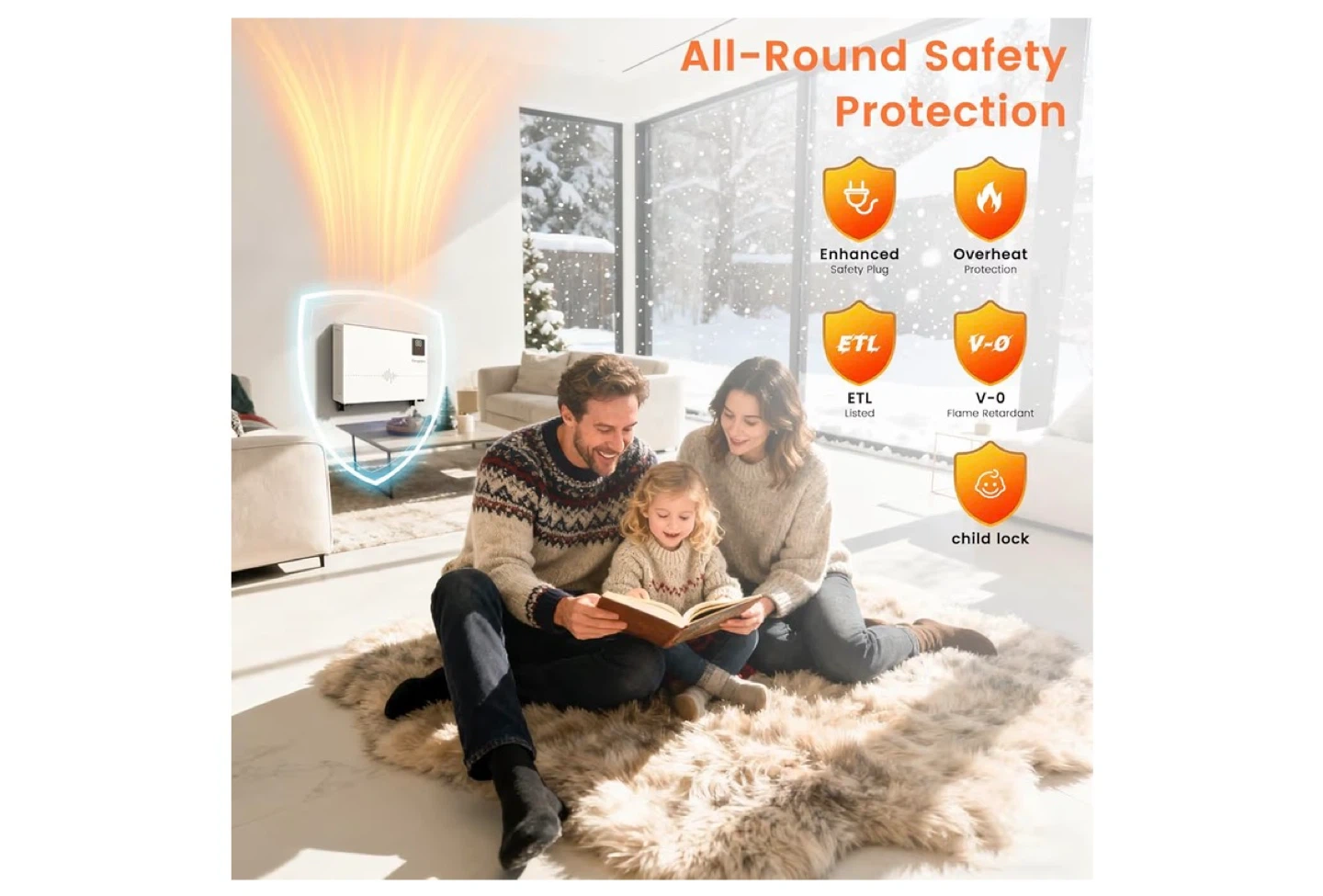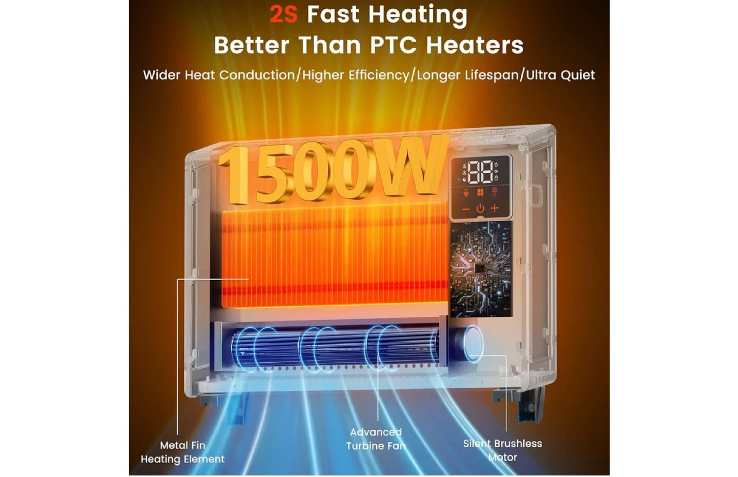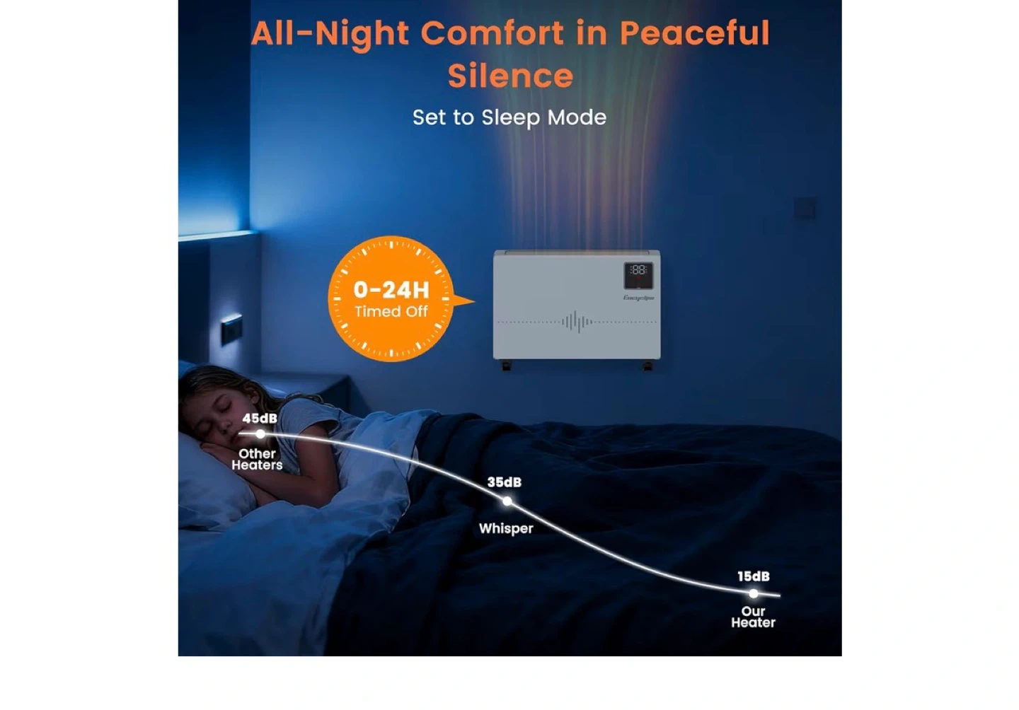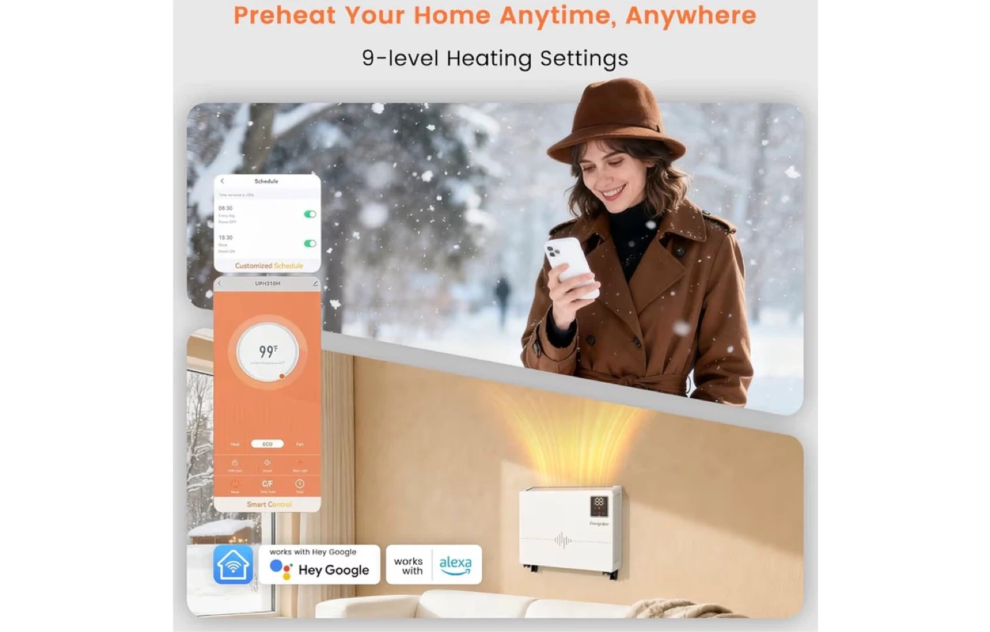 This electric space heater provides 1500W of fast heating with 9-level settings. It's whisper quiet and has 0-24H timed off functionality. Control it via the remote, app, or voice commands with Google Assistant or Alexa!
