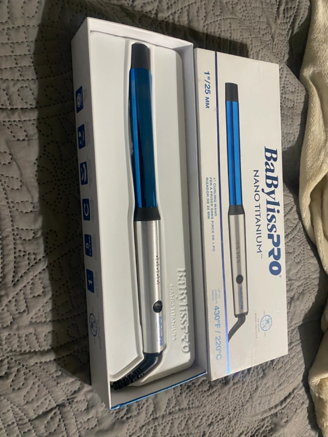 Bran new in box. This is a BaBylissPRO Nano Titanium curling wand with a 1 inch (25 mm) barrel. It heats up to 430°F / 220°C. It includes the original box.