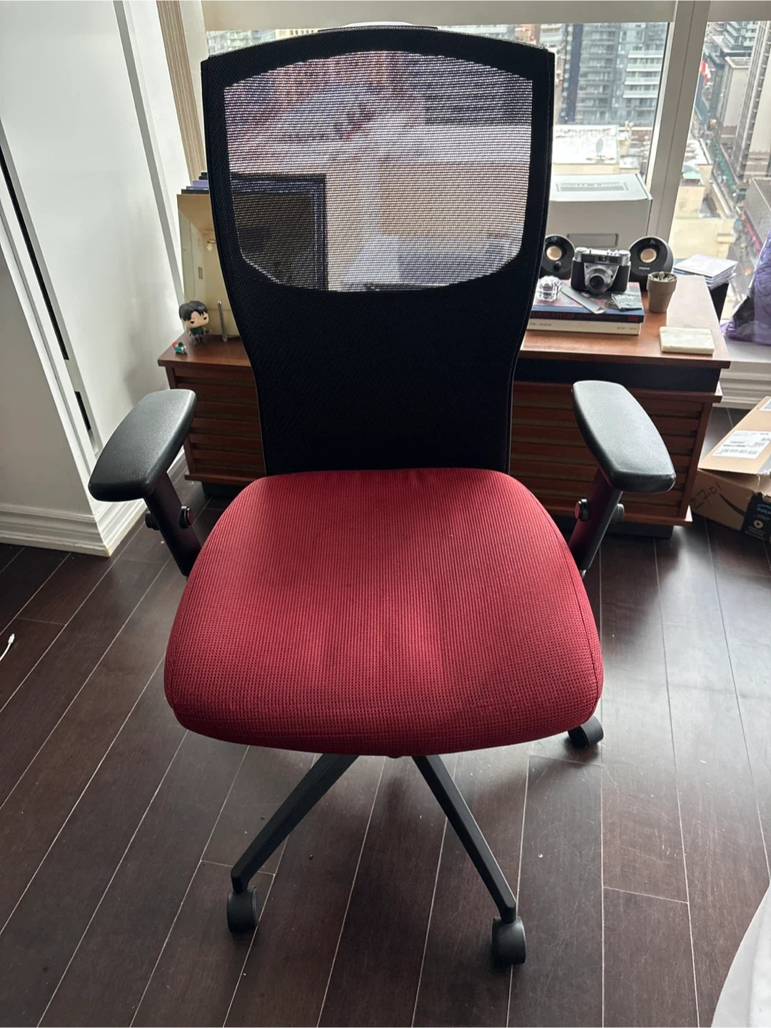 Selling a comfy office chair! It has a red seat and black mesh back, perfect for working from home. The chair is in excellent condition and ready for a home/office workspace.