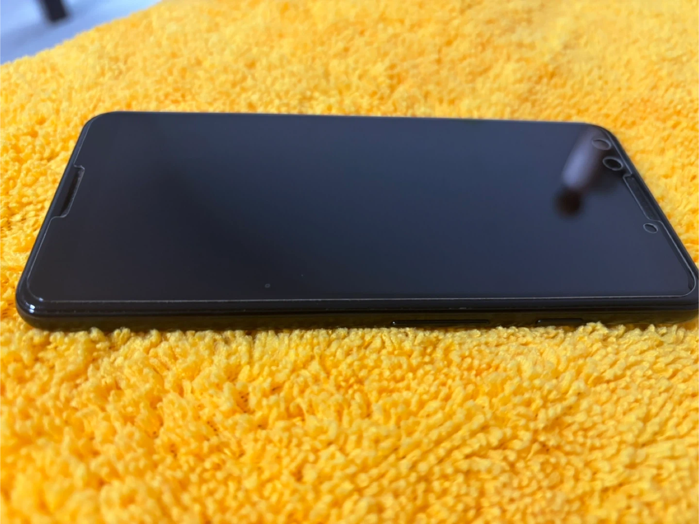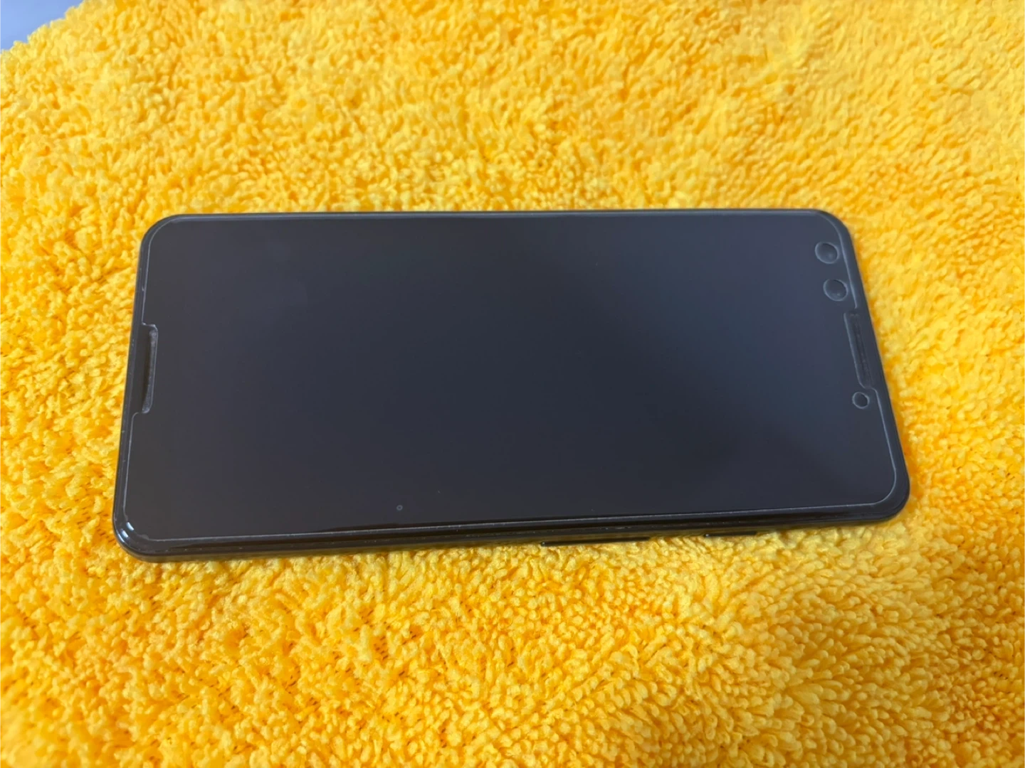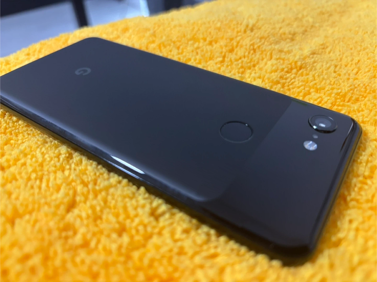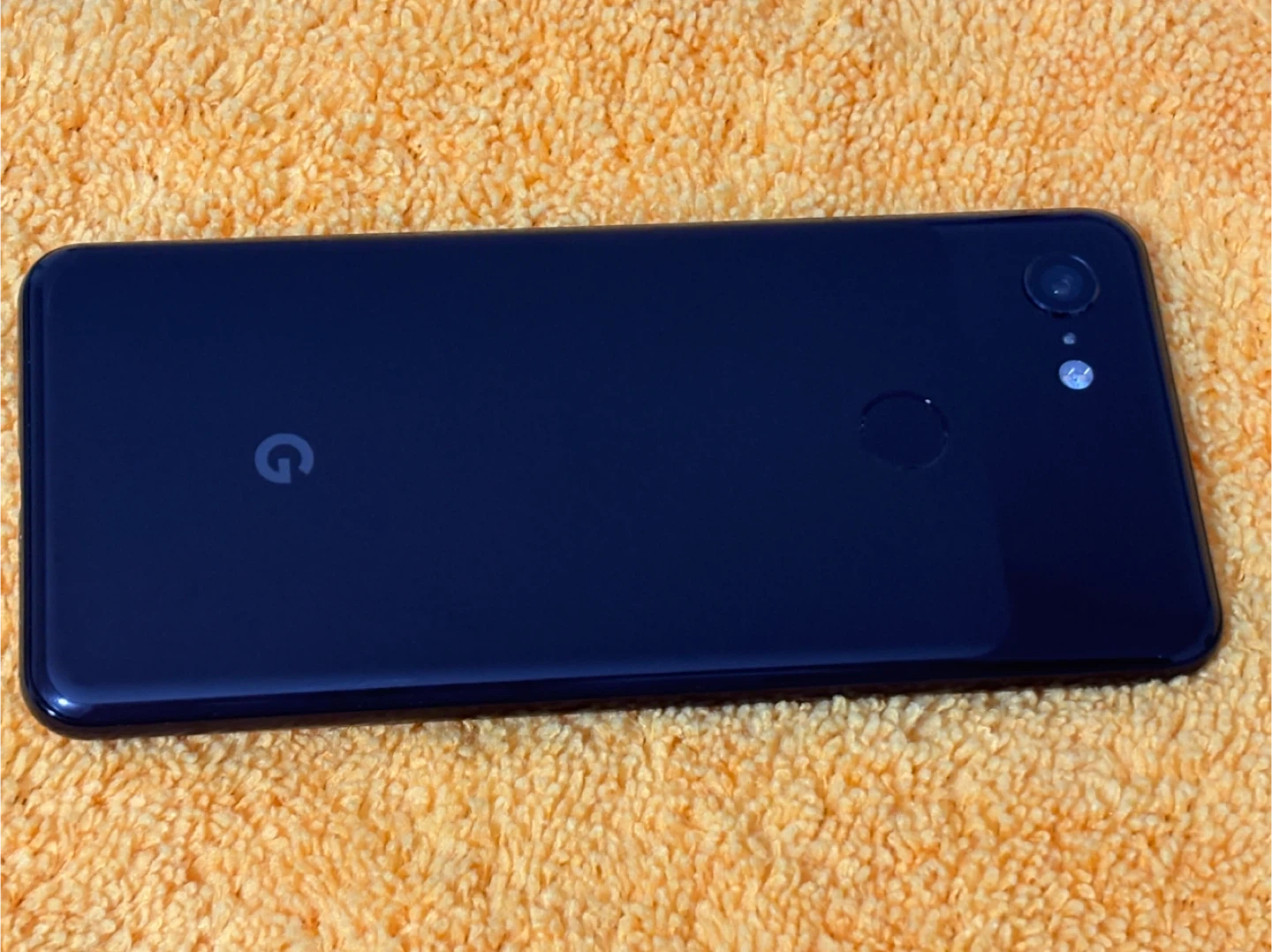 This is a black Google Pixel 3 smartphone. It has a large display and a rear camera. The Google 'G' logo is visible on the back.