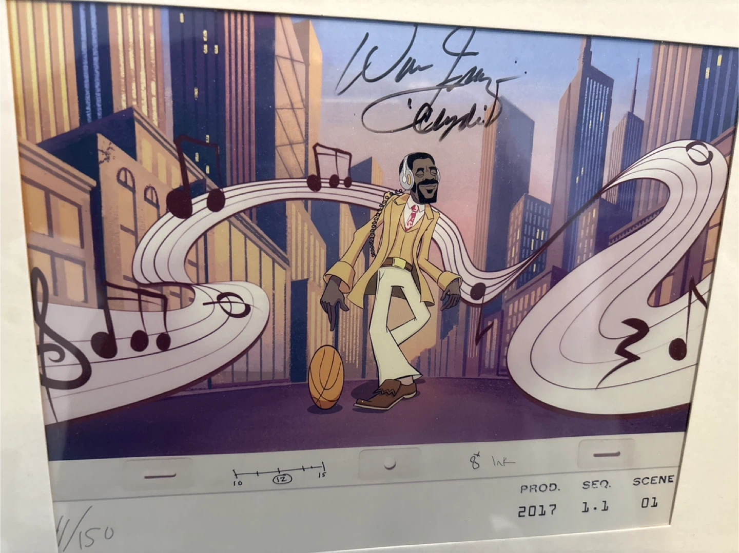 Walt Fraser autographed, animation cel,numbered 11 of 150. It features a character of Walt Frasier with headphones and a basketball, set against a city backdrop with musical notes. The cel is signed and includes production details like date, sequence, and scene number. 13x15 inches