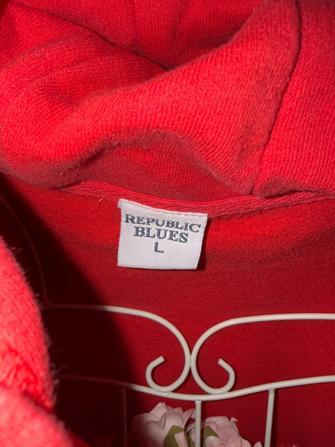 Republic Blues red hoodie featuring "Los Angeles California EST 1781" graphic. It's a size large with front pocket. Perfect for casual wear!