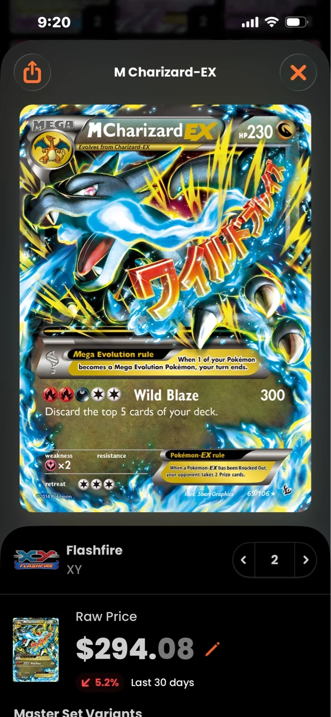 This is a M Charizard-EX trading card from the Flashfire XY series. It has 230 HP and features the Wild Blaze attack. The card is from 2014 and is number 69 out of 106.