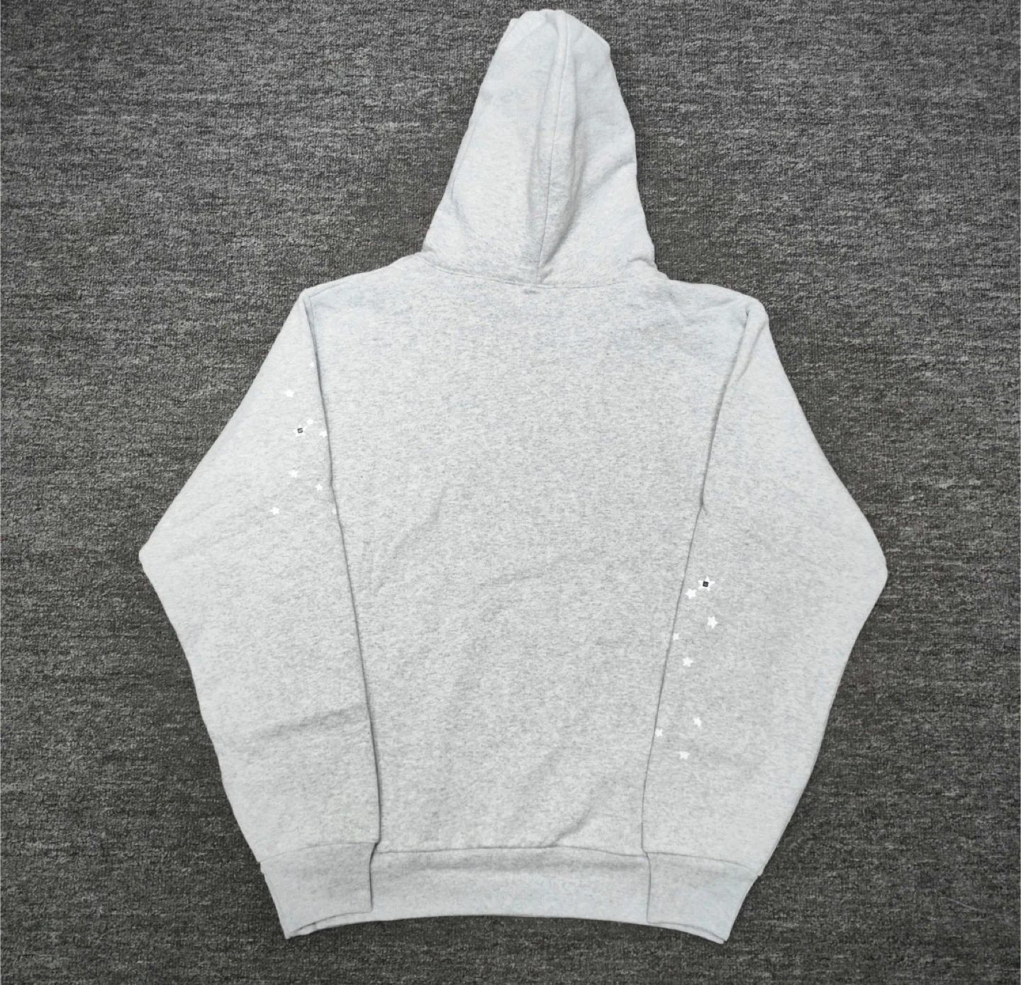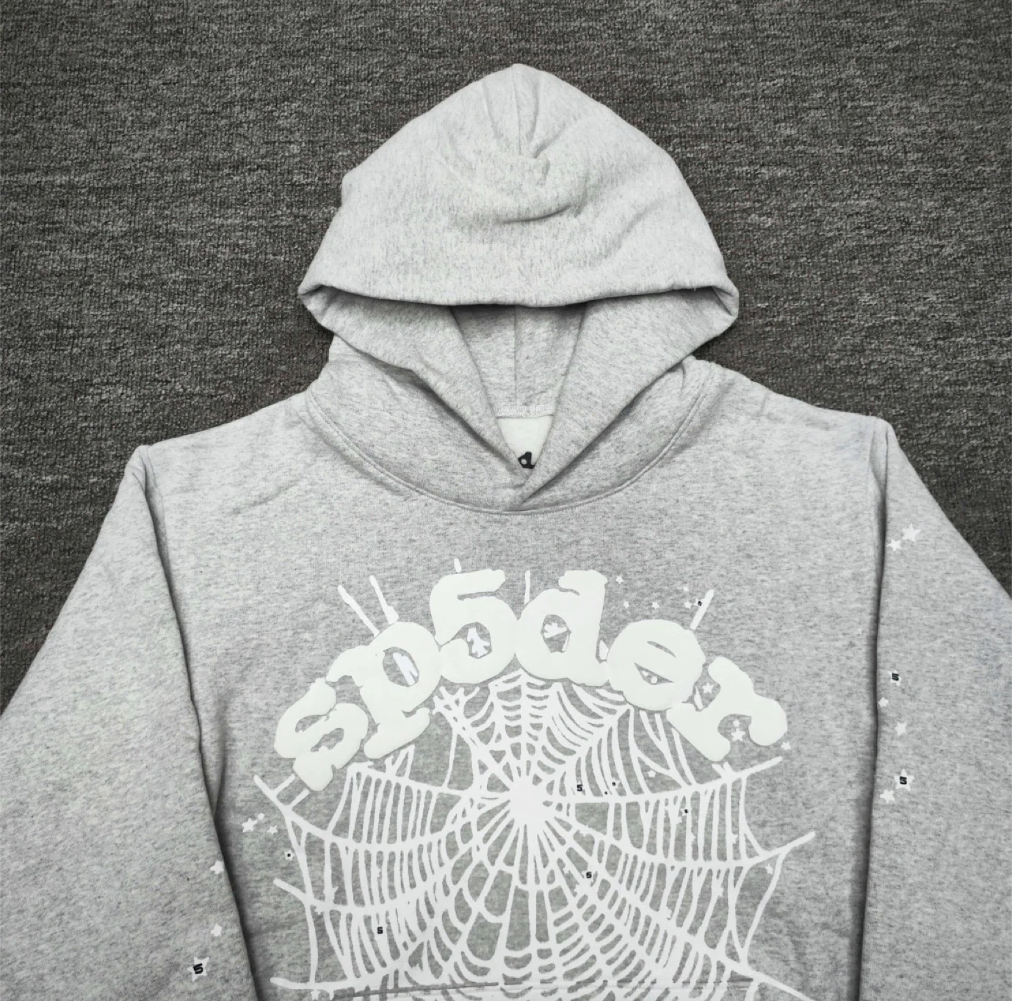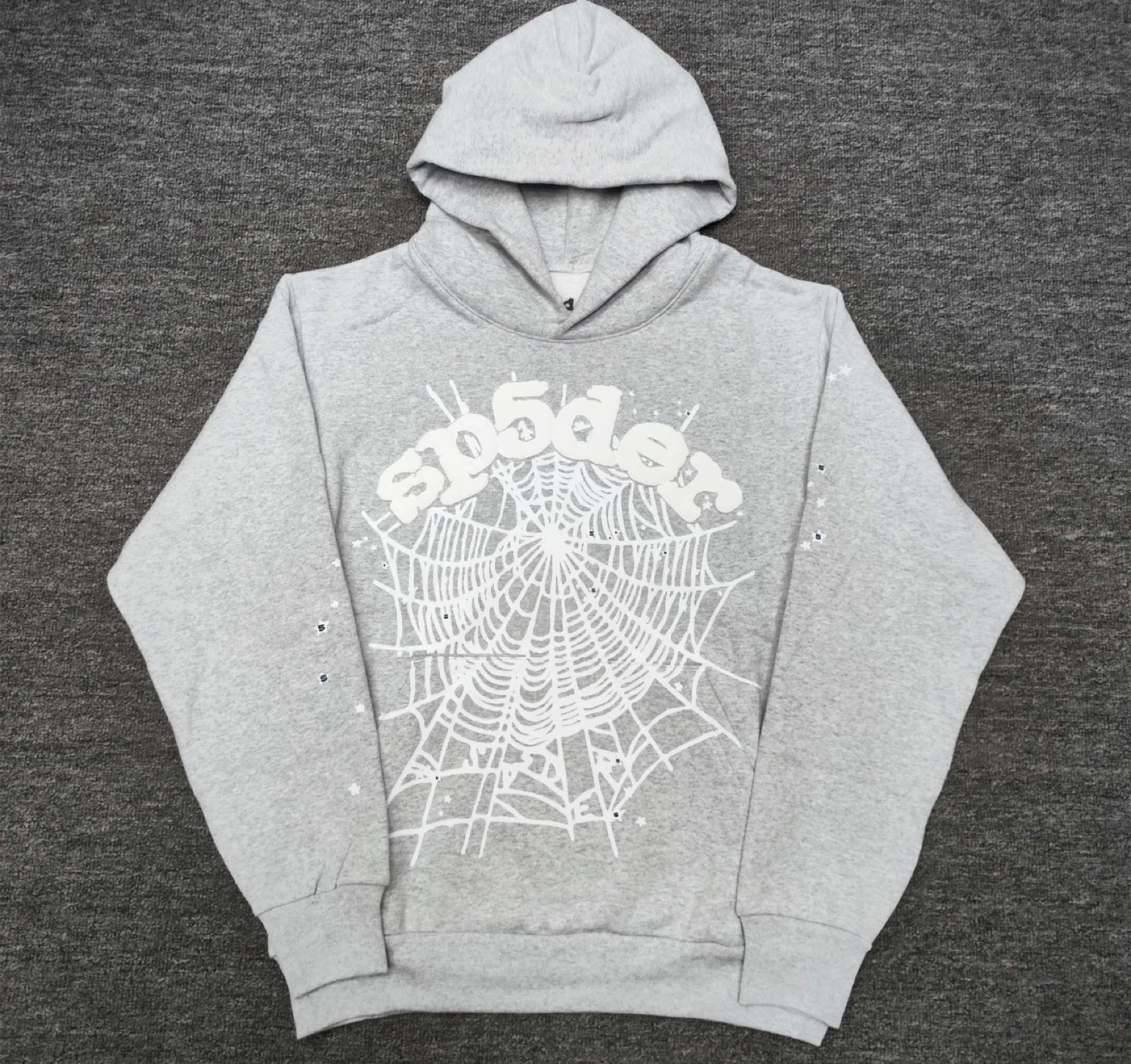 Grey Spider hoodie with a white spiderweb graphic on the front. It's made of a soft cotton blend. Great for casual wear!