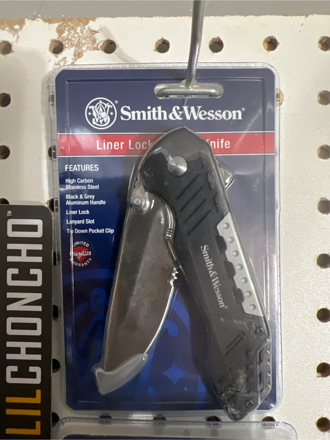 Smith & Wesson folding knife with high carbon stainless steel blade. Features a black & grey aluminum handle, liner lock, lanyard slot, and tip-down pocket clip. It includes a limited lifetime warranty.