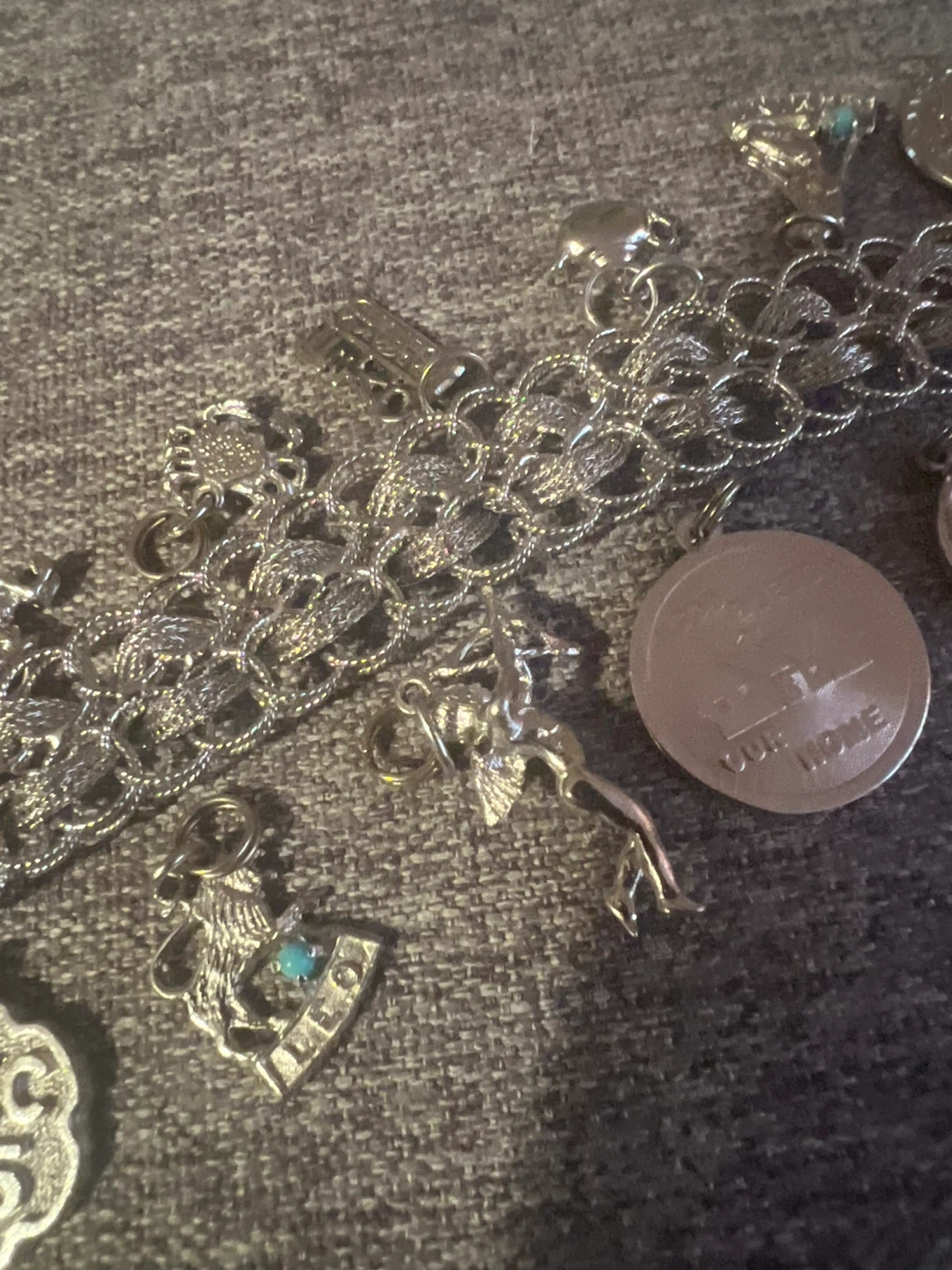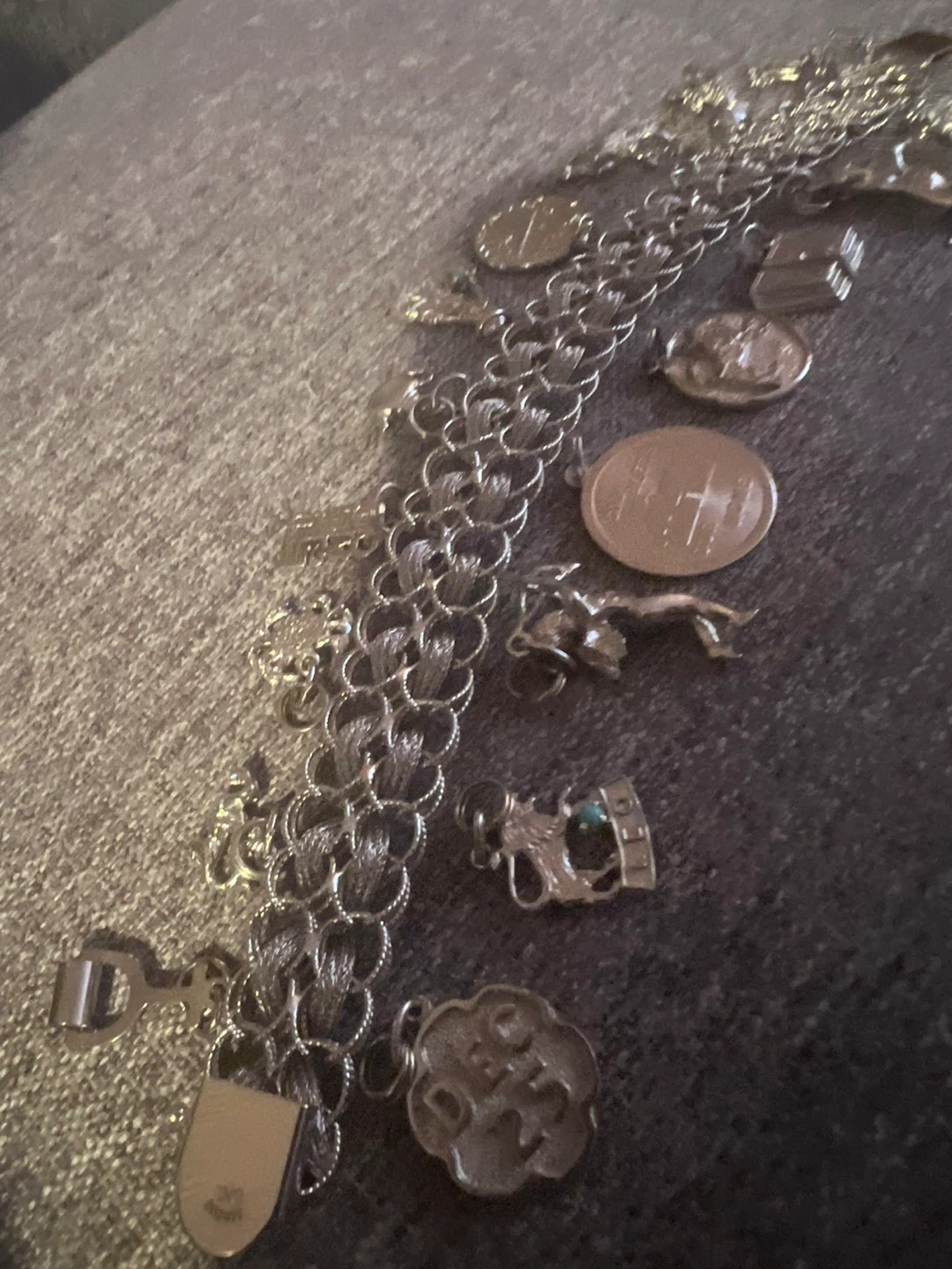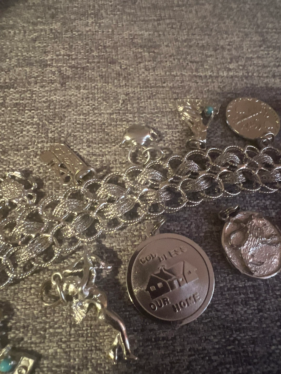 A vintage sterling silver charm bracelet featuring multiple detailed charms. It includes a 'Dec 25' charm and a 'God Bless Our Home' charm and others