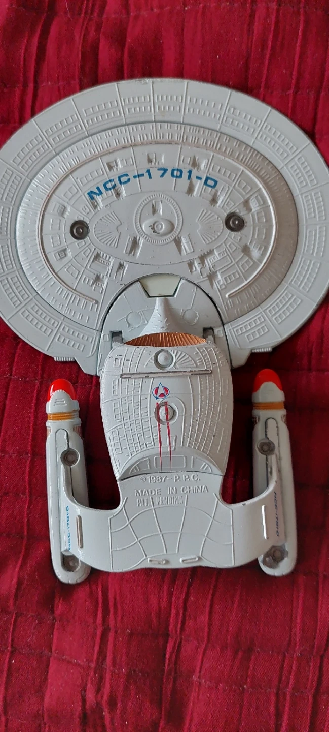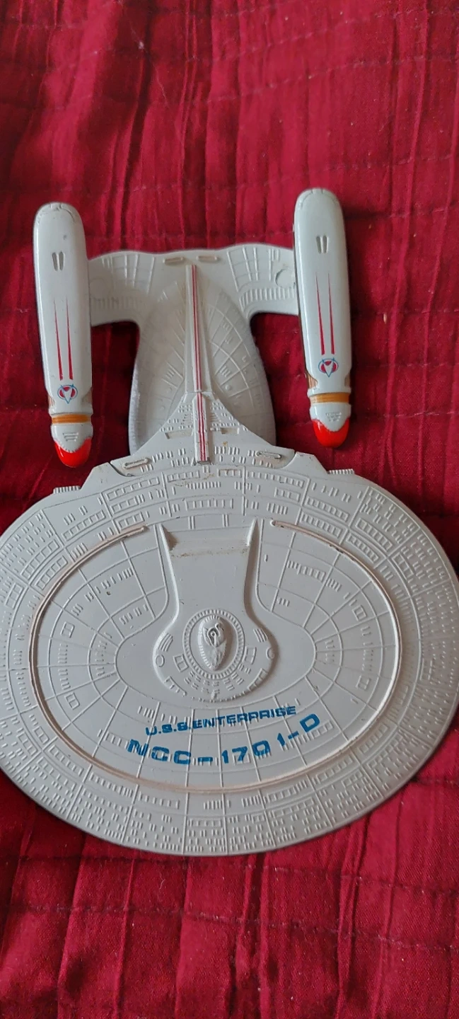 This is a U.S.S. Enterprise NCC-1701-D starship model 1987. It's made of grey metal. The model is grey with red and orange accents. It's a great collectible for Star Trek fans!
