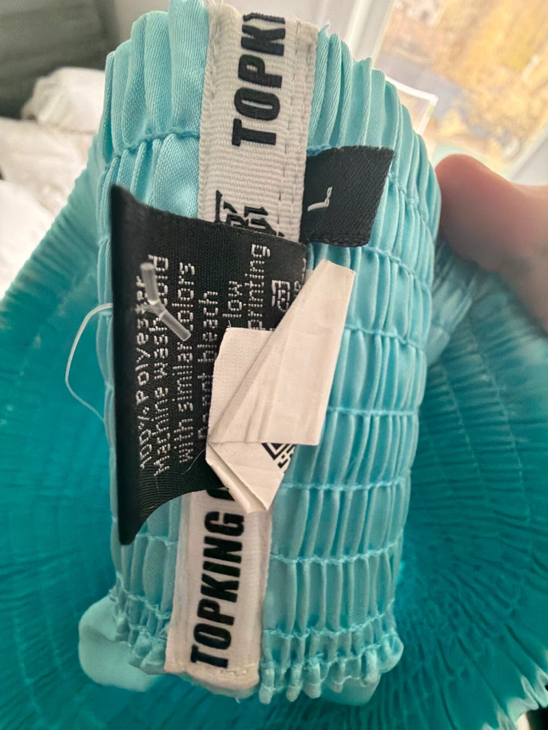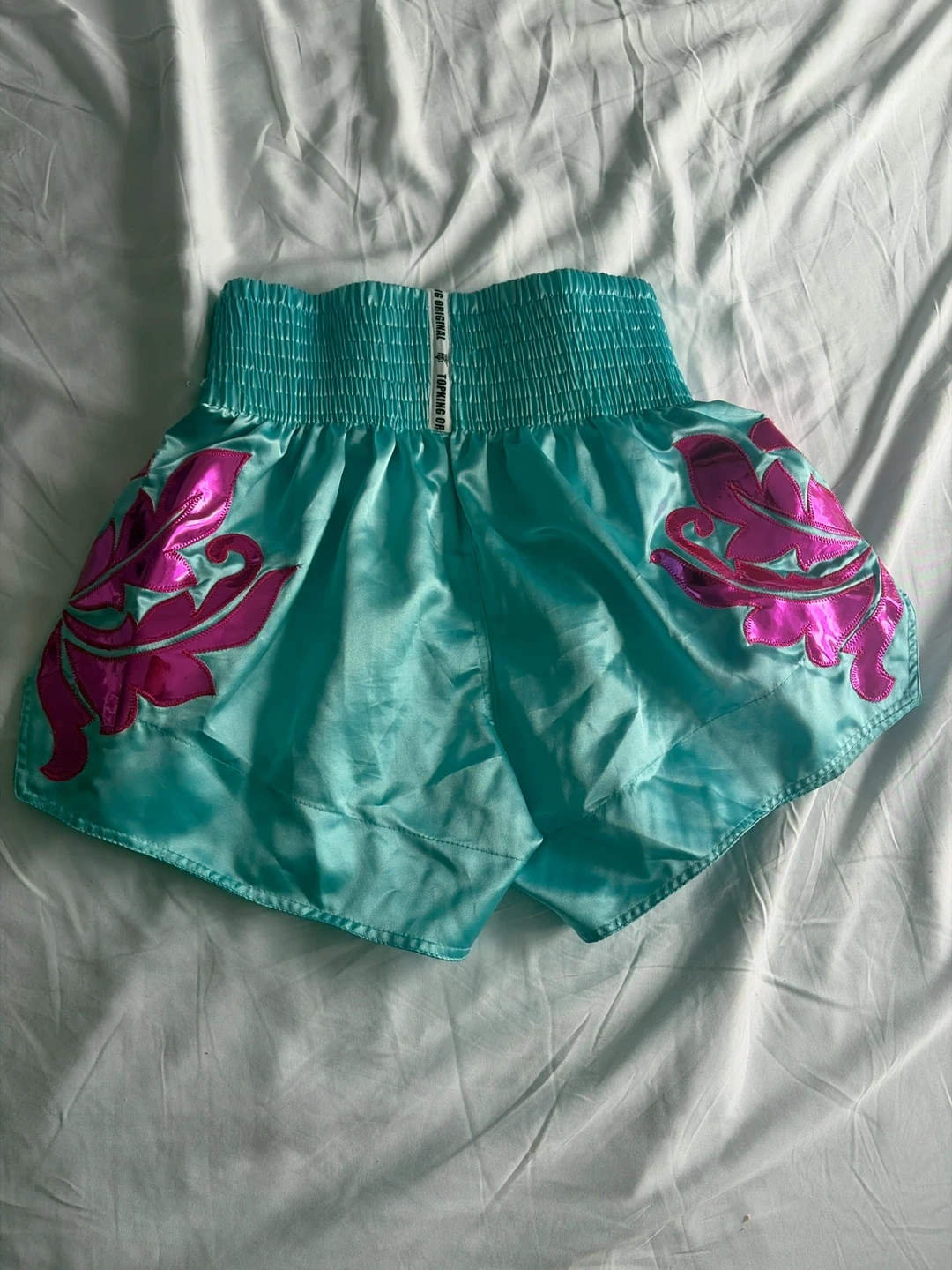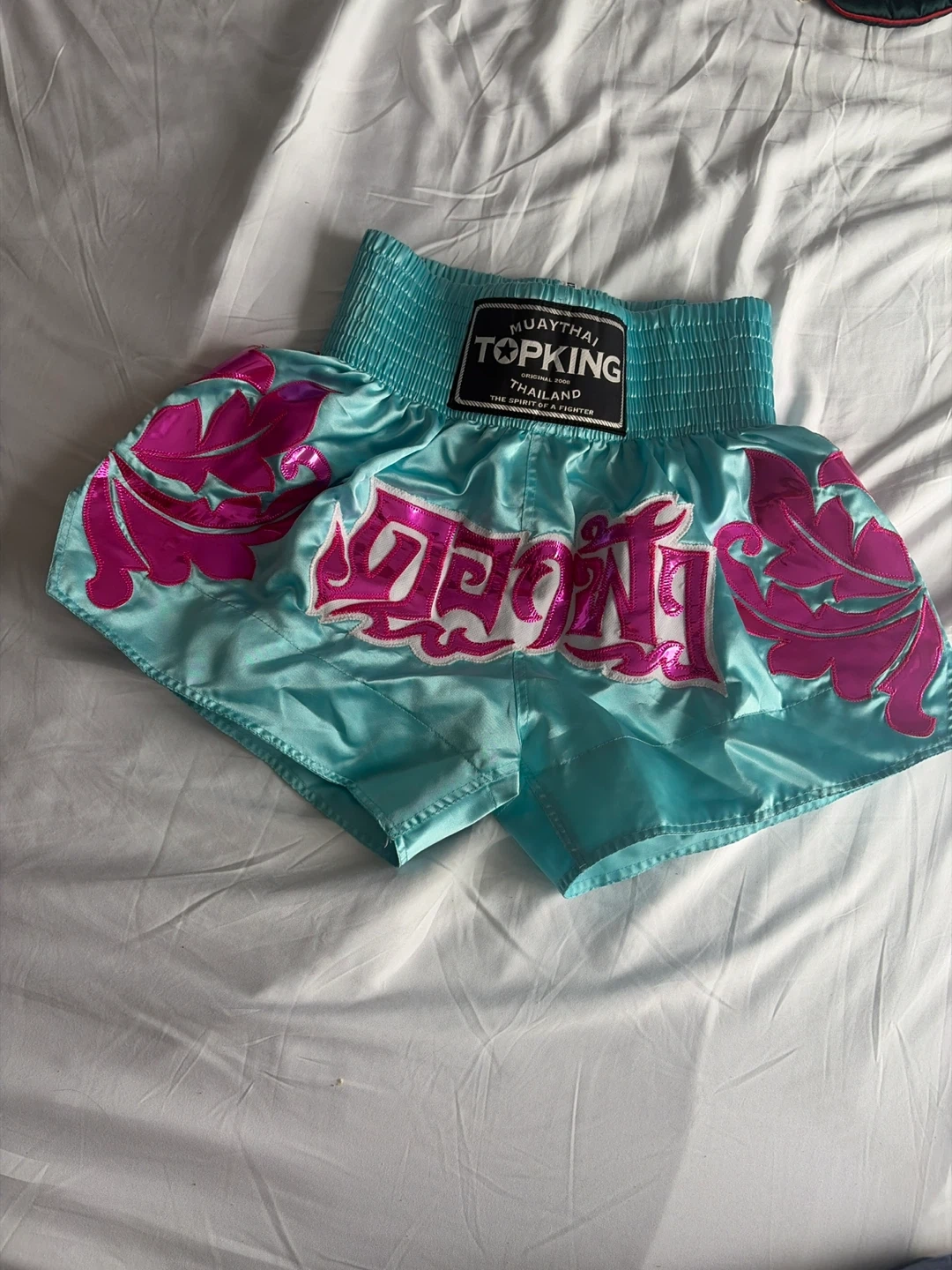 Teal Muay Thai shorts by TOPKING with metallic pink accents. Made from 100% polyester. Size is large.
