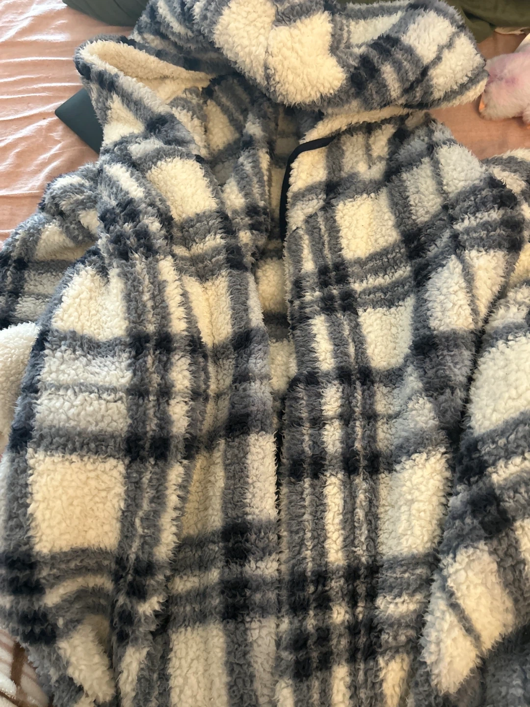 Super soft sherpa hoodie with a blue and white plaid pattern. It's got a cozy, oversized feel. Perfect for chilly days!