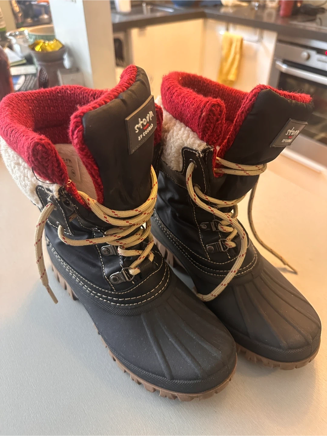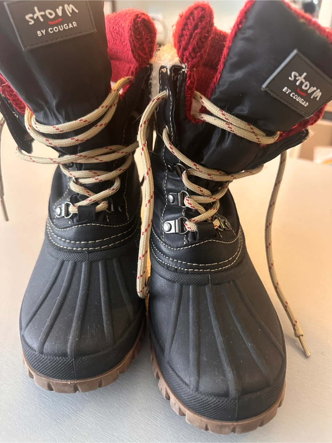 Cozy Cougar Storm winter boots, perfect for braving the Canadian weather. Black with red and cream knit cuffs. Lace-up style. Great for snow, ice and cold. Durable sole. These boots are in great condition.