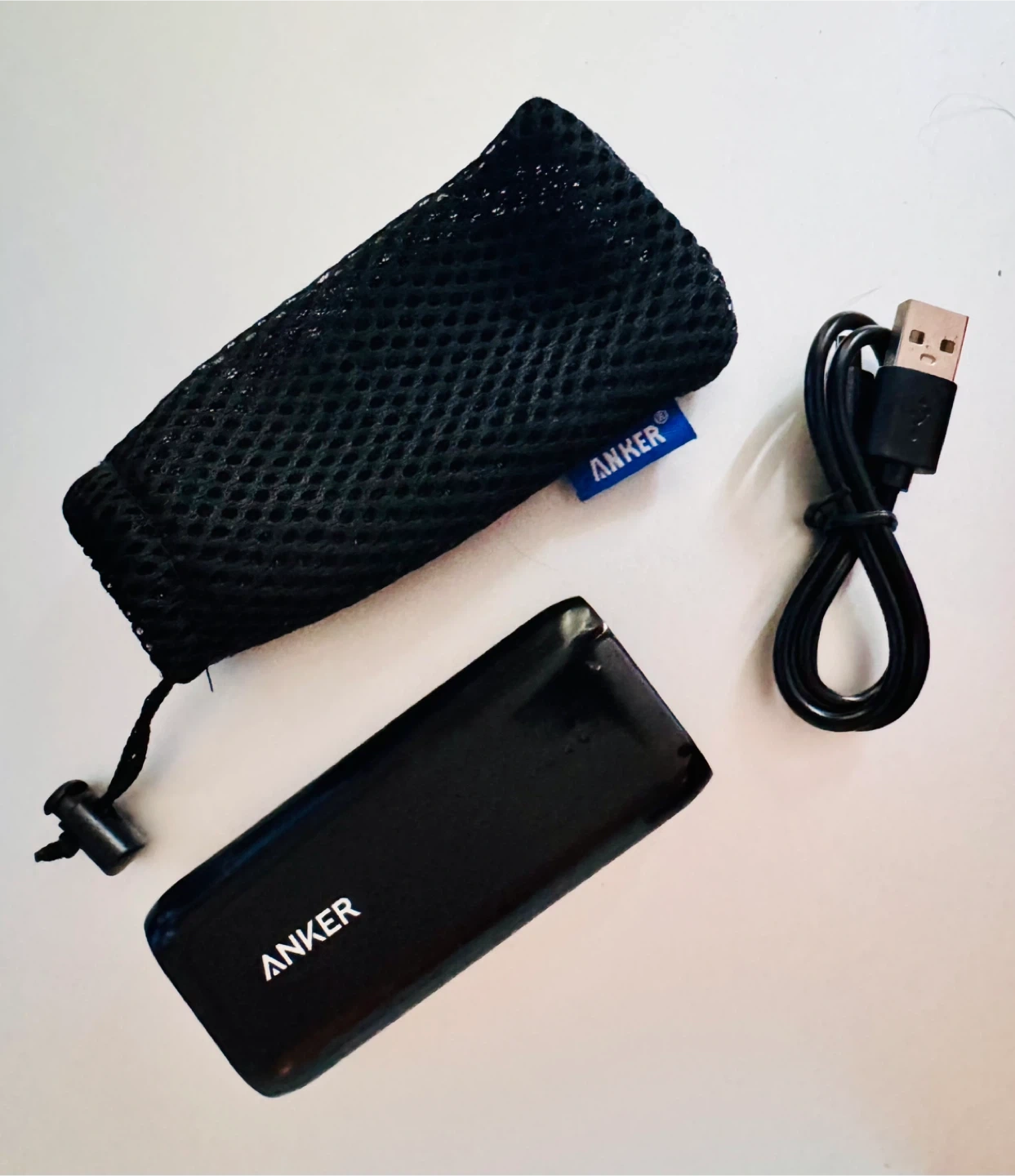 This is an Anker Astro E1, model A1211. It’s an extreme light and portable power bank. It has a capacity of 6700mAh. Includes a carrying pouch and a USB charging cable.