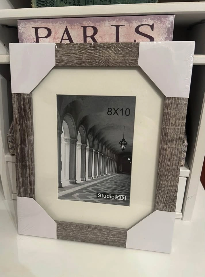 Selling two brand new unopened grey wood frames. 8 x 10 without mat, 5 x 7 with mat.