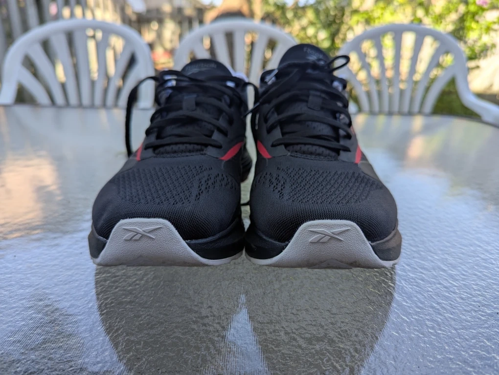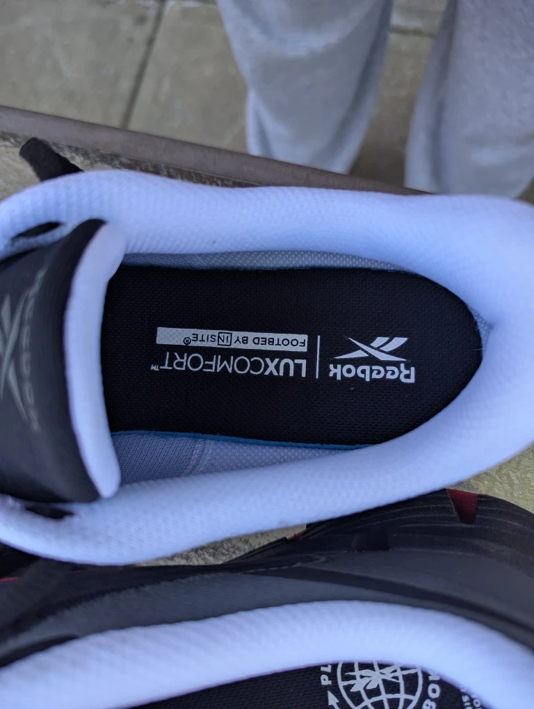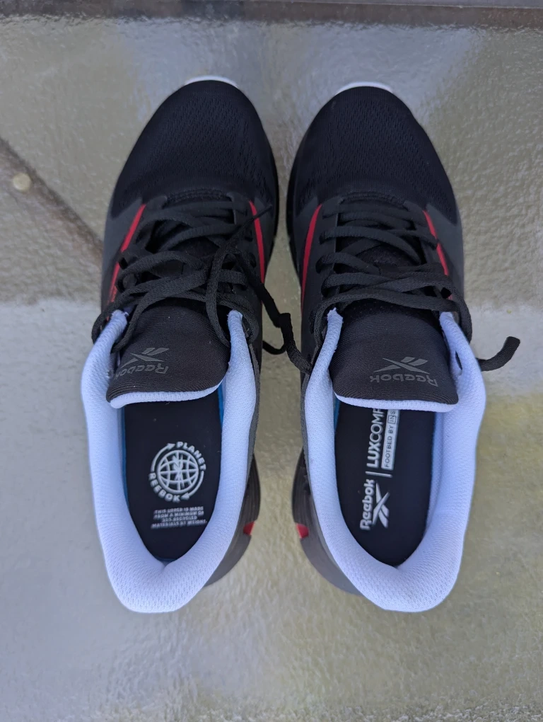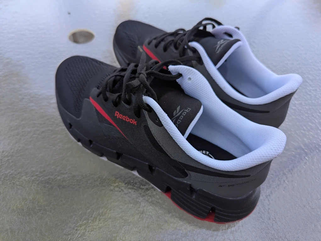 Size 11 Reebok Zig Dynamica 4 running shoes in black with red accents. These shoes feature Floatride Fuel cushioning for a responsive ride. They're lightweight and built for everyday comfort.